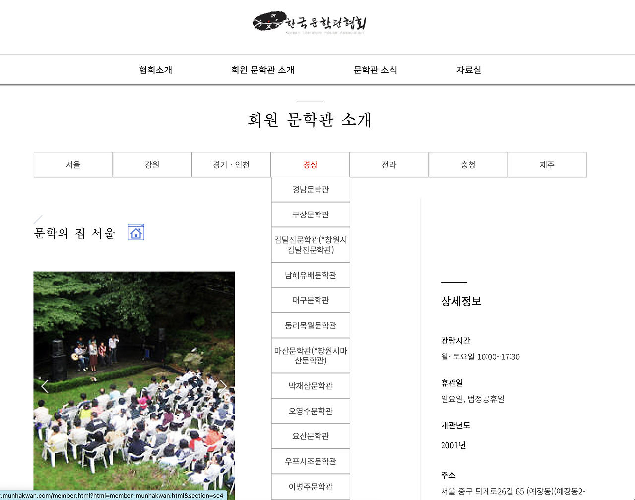작가와 문학관을 검색하던 중 '한국문학관협회(http://www.munhakwan.com/)'가 있다는 것을 알게 되었다. 문학관 대부분이 '한국문학관협회'에 등록이 되어 있다는 사실도 알게 되었다.