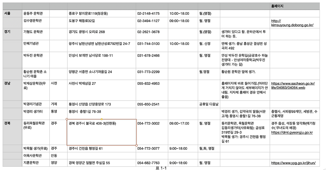 한국문학관협회 홈페이지에는 문학관 별로 '관람시간', '휴관일', '주소', '전화번호' 정보가 정리되어 있어, 문학관 탐방에 꼭 필요한 정보를 제공하고 있었다. 검색의 수고로움이 한 번에 해결되었다. 작가별로 검색어를 넣어 하나하나 스프레드시트에 정리하고 있었는데 '한국문학관협회'의 발견은 대박이었다.