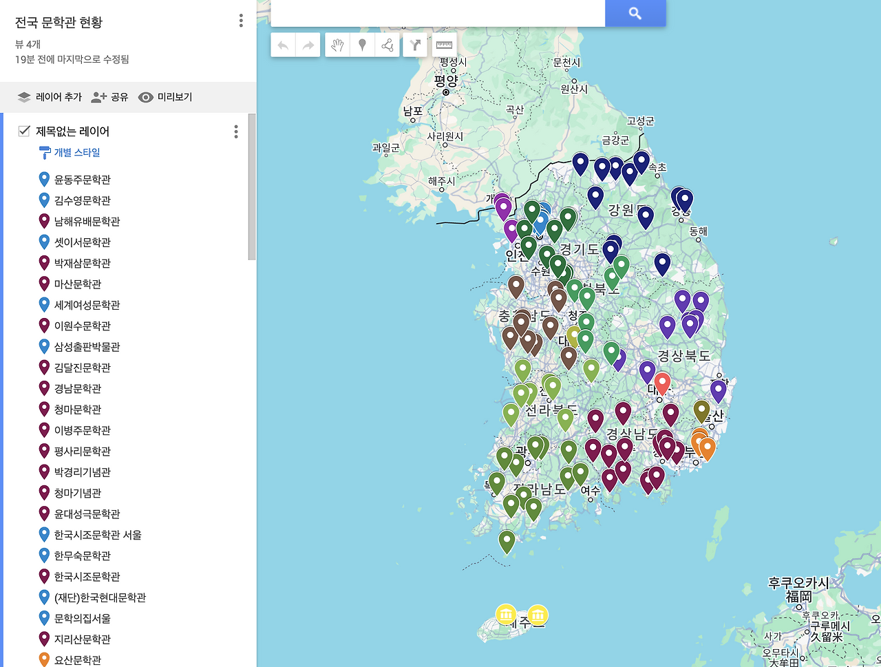 그리고 추가 검색을 하면서, 역시 같은 해 경향신문의 기사(https://www.khan.co.kr/article/201711211020001)에서 구글지도에 표시된 101개 문학관 지도를 디지털 자료로 받을 수 있었는데, 문학관 장소가 정확한 주소로 저장이 가능하다.