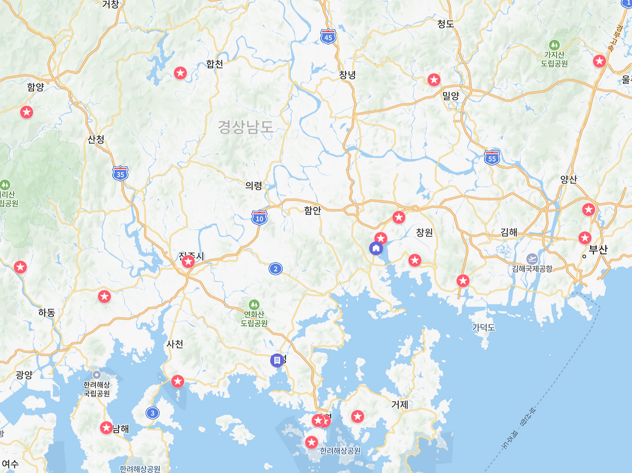 '작가명 + 문학관, 기념관, 생가' 검색어를 넣어가며 찾아 정리하던 작업은 중단하고 문학관협회에 등록된 95개의 문학관을 지도에 표시하는 작업을 하기 시작했다. 내비에 장소를 저장해 놓고 나면 전체 지도를 보고 경로를 정할 수 있다. 어느 문학관을 먼저 가야 하고, 마지막 문학관은 어디로 해야 할지를 한눈에 가늠할 수 있다.