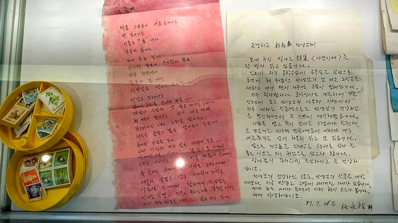 문학관에 방문하면 친필 원고와 편지들을 꼭 보게 된다. 누구누구 형, 누구누구 선생님께로 시작하여 '~ 하셨는지요.' '지난 행사 치르고 몸이 좋지 않아 한동안~' 등등 아날로그 시대에는 문장 하나하나를 정성 들여 완성하고 자신의 마음을 담아 며칠 후에나 받아볼 편지를 소중하게 동봉하여 보내곤 했을 것이다. 나이가 들었는지, 그때의 그 정성된 마음들이 너무 아름답게 느껴진다. 그리고 어찌나 하나 같이 필체가 멋진지, 워낙에 악필인데다, 애들 글씨 같은 필체를 가진 나는 늘 그런 '으른의 필체'가 부럽다.