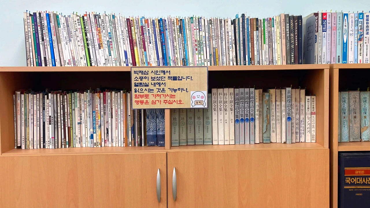 '박재삼 시인께서 소중히 보셨던 책들입니다. 열람실 내에서 읽으시는 것은 가능하나, 함부로 가져가시는 행동은 삼가 주십시오.'