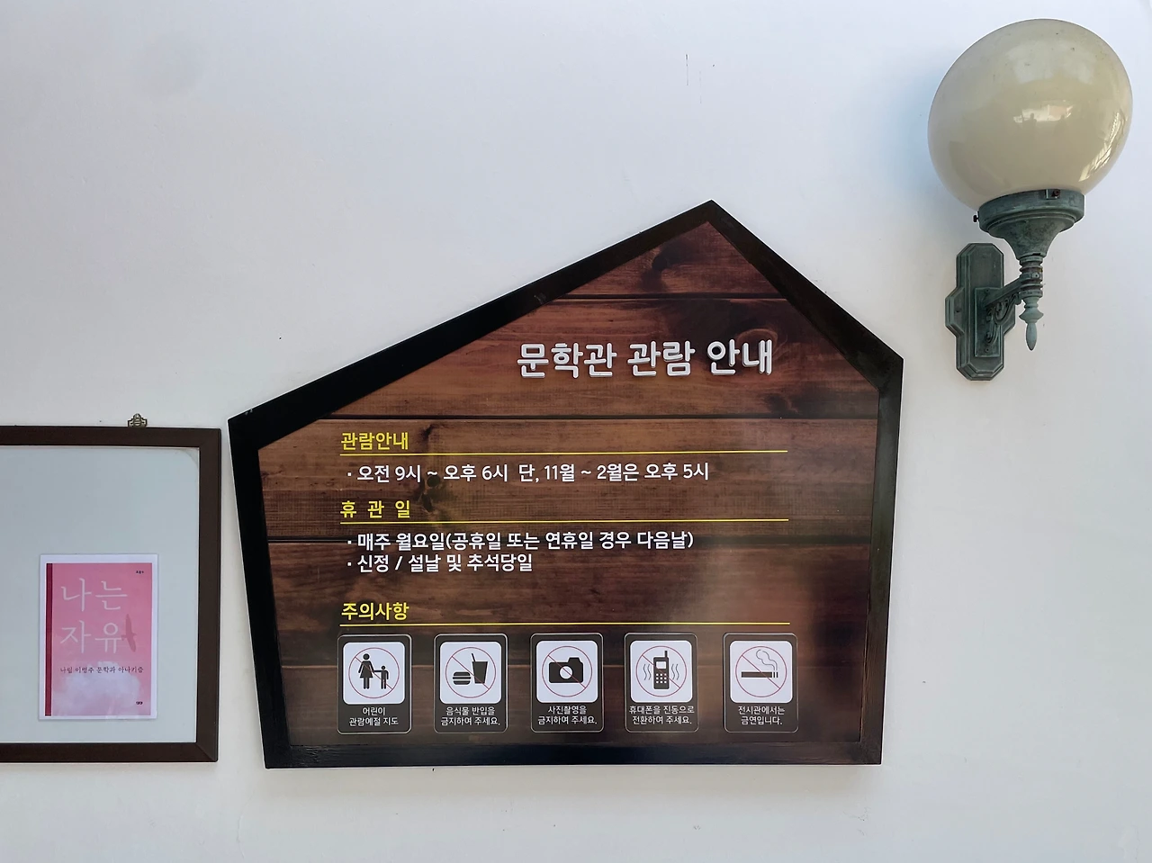 문학관 관람 안내 - 사진 촬영 금지 안내가 있다.