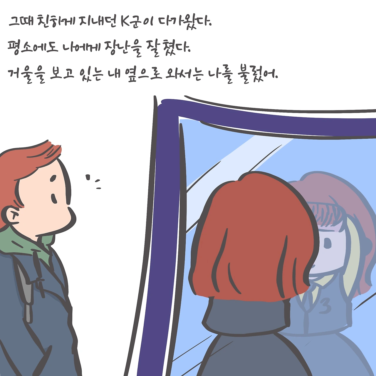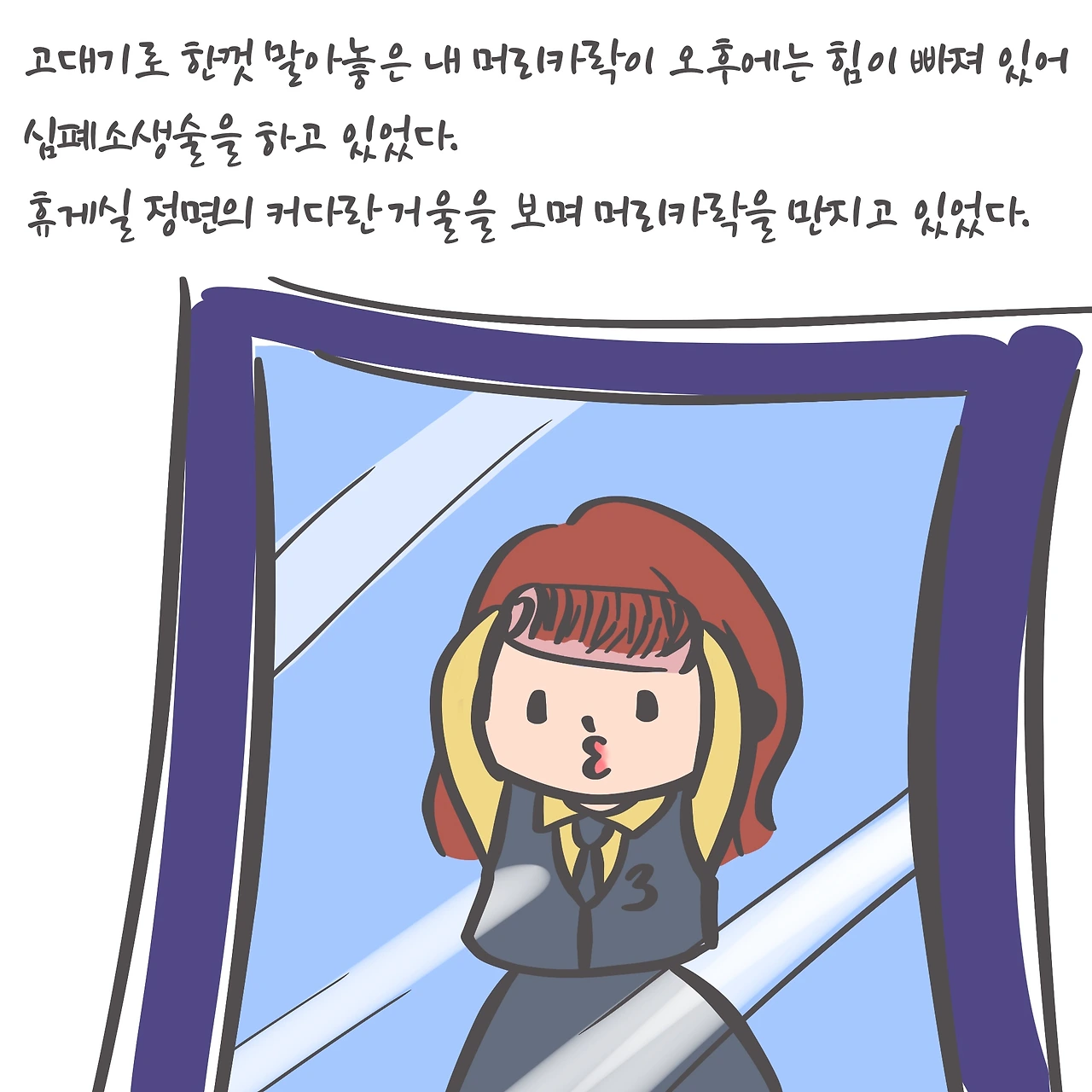 학원 휴게실에서 거울을 보고 있었다.