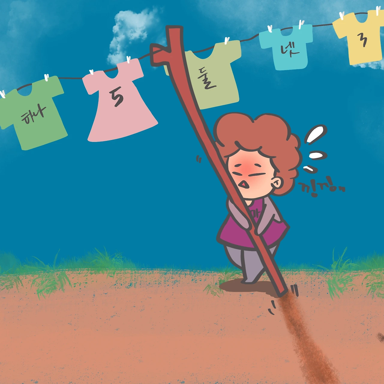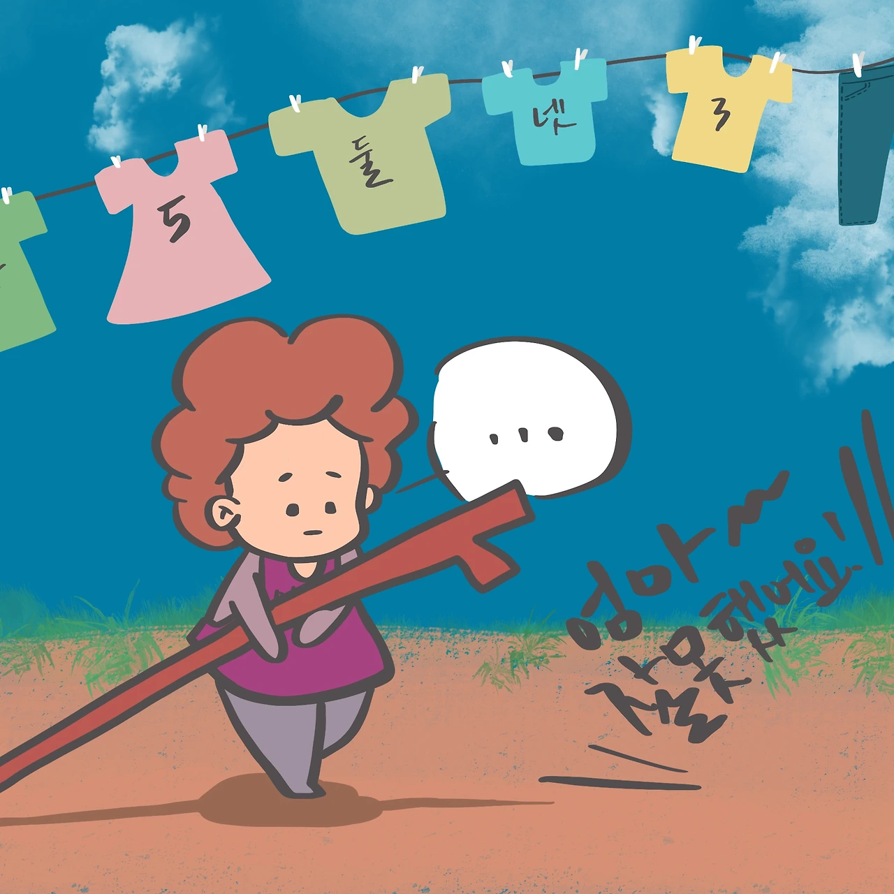 잠시 뒤 엄마는 빨랫줄 지지대를 들고 오셨는데