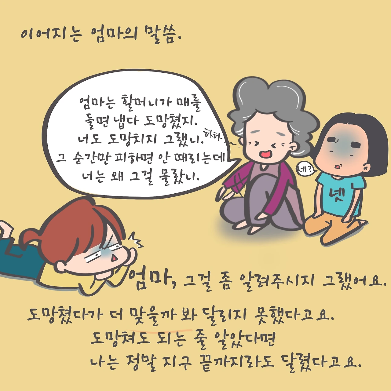 어릴 때 나는 엄마가 너무 무서웠어.엄마 힘이 좋아서 매를 들면 정말 너무 아팠거든.