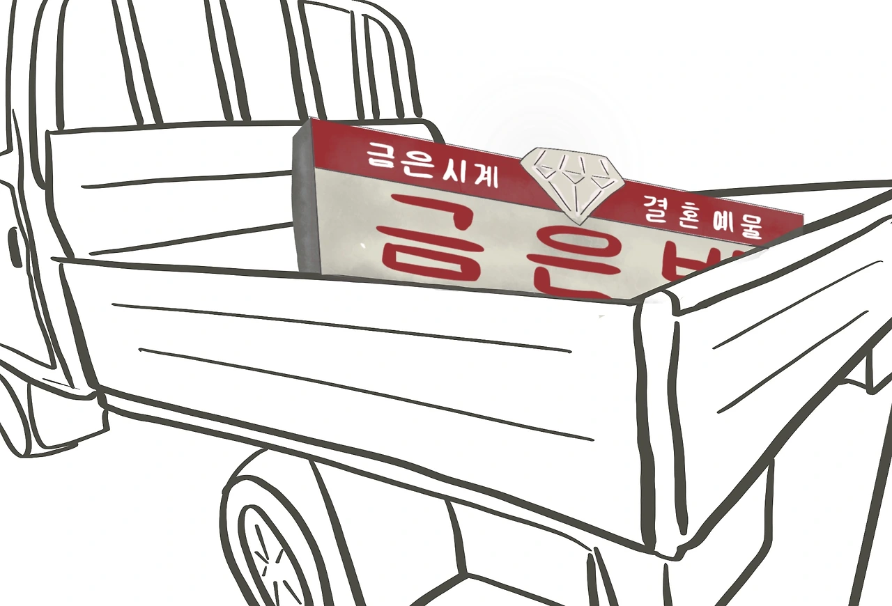 트럭 짐칸에 실린 금은방 간판을.