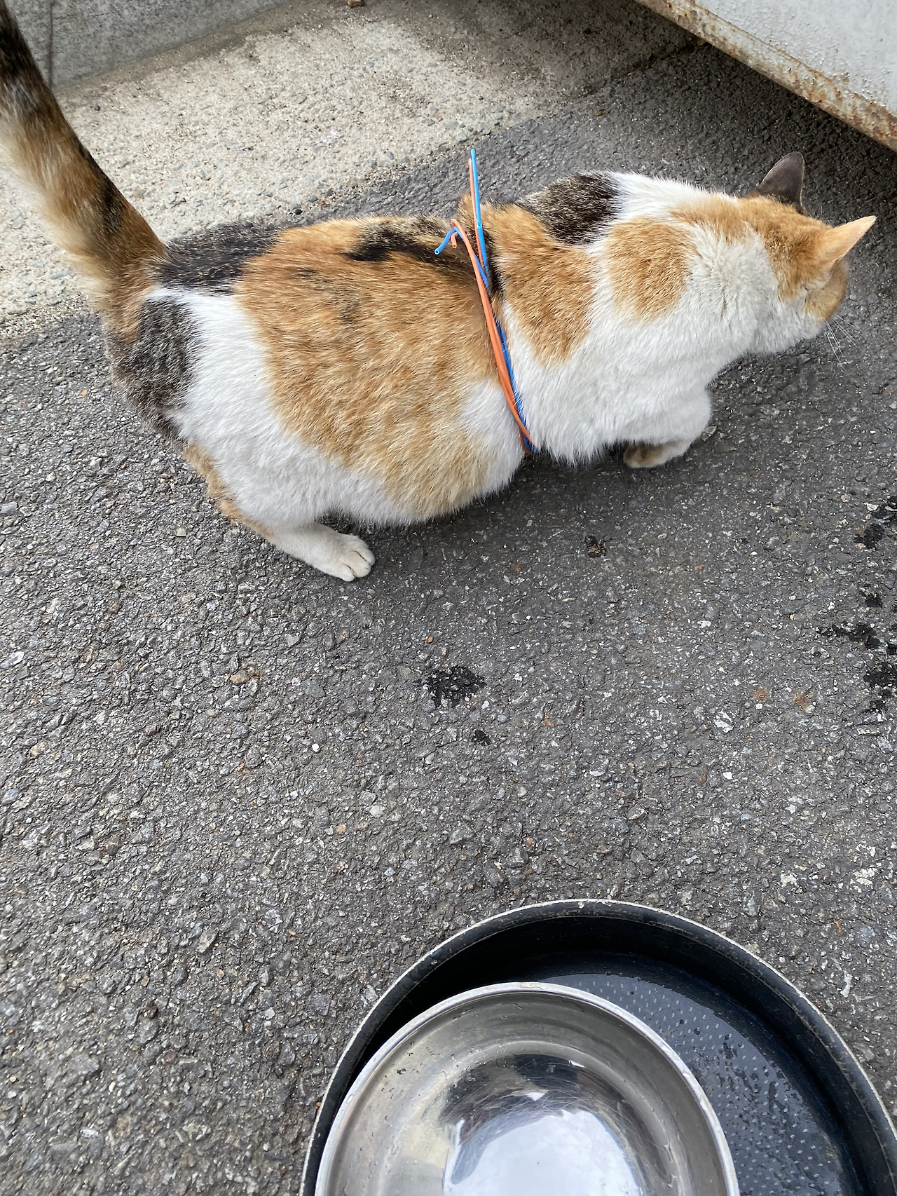밥 주러 갔다가 배에 무언가 감긴 것을 보고 너무 놀랐다.