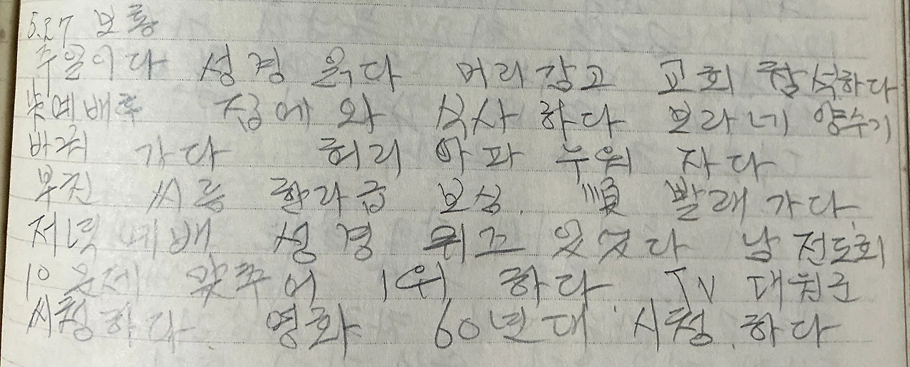 사실 일요일 아빠 일기는 교회에서의 일이 반복적으로 기록되어 있어 사실상 크게 다룰 내용이 없다. 그래서 일요일 일기는 다루지 않으려고 했는데. 그냥, 오늘은 다루고 싶어서 올렸다. 빨래터에 갔다는 엄마의 일상도 그냥 적고 싶었다. 생각해 보면 시아버지, 노동하는 아빠, 그리도 다섯 딸들 빨래를 어떻게 해냈나 싶다. 엄마는 정말 아무나 하는 것이 아니다. 엄마는 그걸 어떻게 했냐 물으면 분명 이렇게 말씀하시겠지. 그럼 어째?