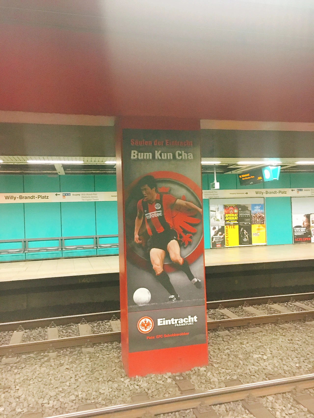 없는 시간에 굳이 짬을 내어서 프랑크푸르트를 둘러보기로 한 까닭은 바로 '차붐'의 흔적을 찾고 싶어서 였다. 유로타워 옆 Willy-Brandt-Platz역 승강장에 있는 차범근 선수의 사진을 직접 보고 싶었다. 당당히 프랑크푸르트의 레전드들과 어깨를 나란히 하고 있는 모습을 보자니 기분이 묘했다. 쓸쓸하고 외로운 낯선 도시의 새벽, 그곳에 마치 아무렇지 않다는 듯 서있는 차붐의 모습을 보고있자니 그가 이 먼 타국에서 어떤 심정으로 뛰었을까 괜히 궁금했다.