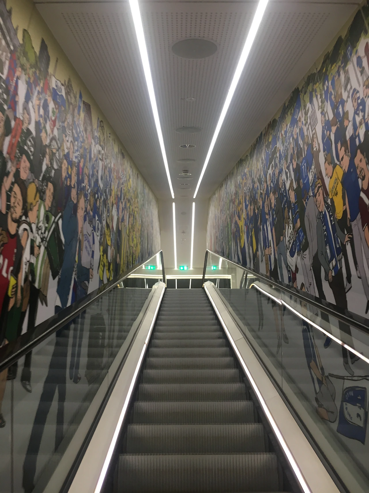 날씨는 화창했고 역은 한산했다. 역은 누가 봐도 축구장으로 가는 역인걸 알 수 있을 정도로 간단하지만 잘 꾸며져 있었다. 주로 월드컵에 관한 벽화가 새겨져 있어 내 기대를 한층 더했다. 역에서 경기장까지는 꽤 많이 걸어야 한다고 들어 부지런히 출발을 했다. 다행히 길이 어렵지 않아 금방 경기장 가는 길을 찾을 수 있었다.