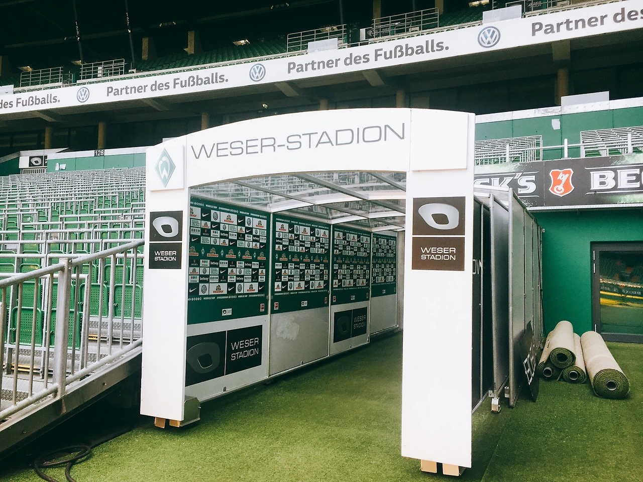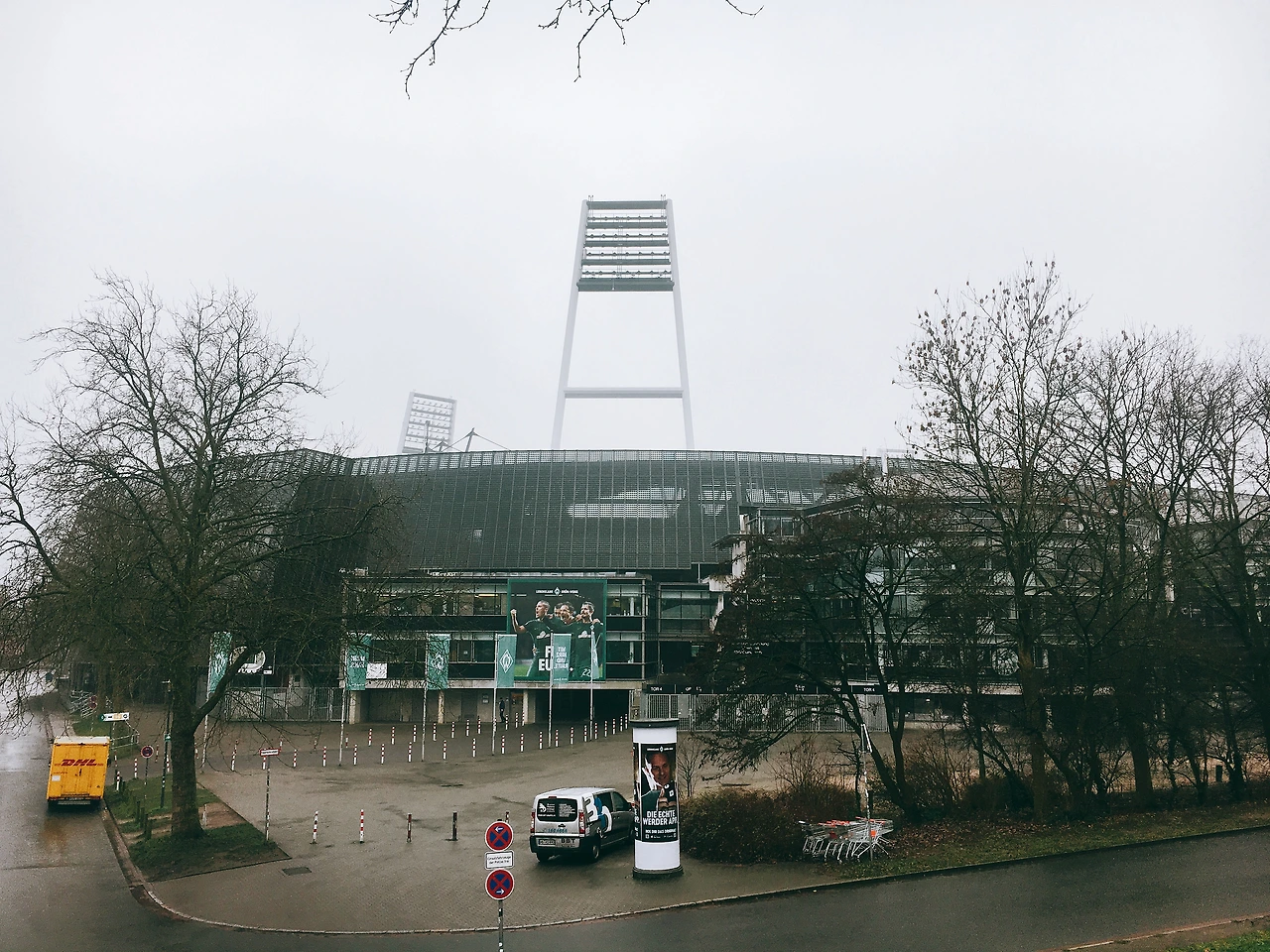 그렇게 도착한 곳이 바로 베르더 브레멘의 홈구장, 베저 슈타디온이다. 대충 '베저 강변에 있는 경기장' 정도로 이해하면 좋을것 같다. 브레멘 중앙역에서 트램을 타고 가다 내려서 강변으로 쭉 걸어 내려오면 탁 트인 풍경과 함께 베저 슈타디온을 만날 수 있다. 브레멘을 외질과 마르코 마린 시절부터 좋아하기도 했었고, 예쁜 엠블럼과 유니폼 디자인 때문에 관심있었던 터라 꼭 한번 와보고 싶었던 곳이었다. 다른 두곳과는 분위기가 사뭇 달랐지만, 확실히 독일의 경기장들은 주로 웅장한 느낌이었다. 잉글랜드에 네모네모하고 오래된 아담한 경기장들과는 전혀 다른 느낌이었다. 경기장에 도착해 미리 예약한 투어 시간에 맞춰 접선장소에 가니 가이드가 한분 나와 있었다. 이메일까지 동원해 가며 겨우겨우 신청했던 투어라 그런지 나와 가이드 단 둘이 투어를 진행했다.