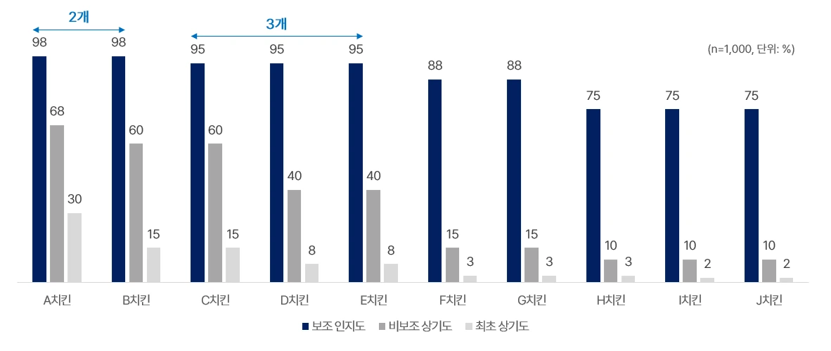 배달치킨 카테고리와 같이 소비자들에게 익숙한 카테고리(예를 들어, 햄버거 등)는 유사한 패턴의 브랜드 인지도 수치가 나올 수 있겠지만, 그렇지 않은 다른 카테고리의 경우 90% 수준의 보조 인지도를 지닌 브랜드가 1~3개 사이 정도일 가능성이 높습니다.