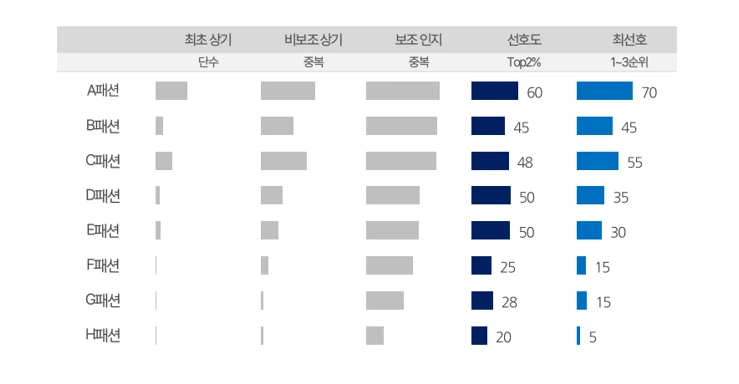 이 경우에는 1, 2순위 답변을 받아 분석했을 때 변별력이 크지 않은 것으로 판단해서 1, 2, 3순위까지의 답변을 추가로 분석했고, A패션이 70%로 가장 높은 선호도를 보였습니다. 그다음으로는 C패션, B패션 순으로 선호도가 분석되었는데 이는 신기하게도 최초 상기도 순서와 동일한 것으로 나타났습니다.