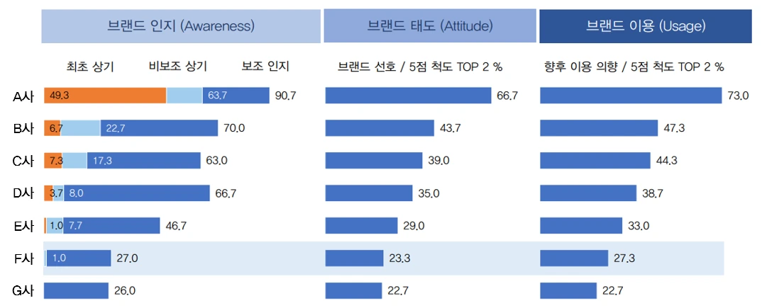 최상위권인 A사는 브랜드 인지도가 90.7%이면서 최초 상기도가 49.3%로 시장 내 압도적 1위 브랜드입니다. 하지만 인지에서 선호로 넘어가는 구간이 선호에서 이용의향으로 넘어가는 구간 대비 병목구간(Bottle neck)으로 추정되기 때문에 A사는 브랜드 선호도 제고가 가장 시급한 문제이자 목표일 것입니다.