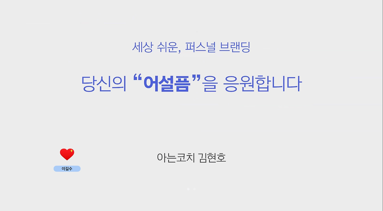 어제 저녁, “조직에서 나만의 포지션을 찾는 방법: 세상 쉬운 퍼스널 브랜딩 A to Z”라는 온라인 특강을 들었다. 요즘 퍼스널 브랜딩 관련 책을 다양하게 접하고 있지만, 결국 그 핵심은 비슷하다. ‘어떤 방식으로 나를 표현할 것인가’, ‘어떤 결과물을 남길 것인가’, ‘나다움을 어떻게 발견하고 언어화할 것인가’—모든 프로세스는 이 흐름 안에 있다. 어제 강연을 맡은 김현호 코치님은 삼성전자 전략마케팅팀에서 25년을 근무한 마케팅 전문가였다. 그분이 말한 퍼스널 브랜딩의 핵심 키워드는 “Help”. 내가 누구를, 어떻게 도울 수 있는지를 구체적으로 설명할 수 있어야 한다는 것. 그보다 더 마음을 깊이 건드린 문장은 강연의 마지막 슬라이드에 조용히 남아 있던 한 문장이었다. “당신의 어설픔을 응원합니다.” 그 문장은 강렬하고도 다정하게 나를 위로했다.