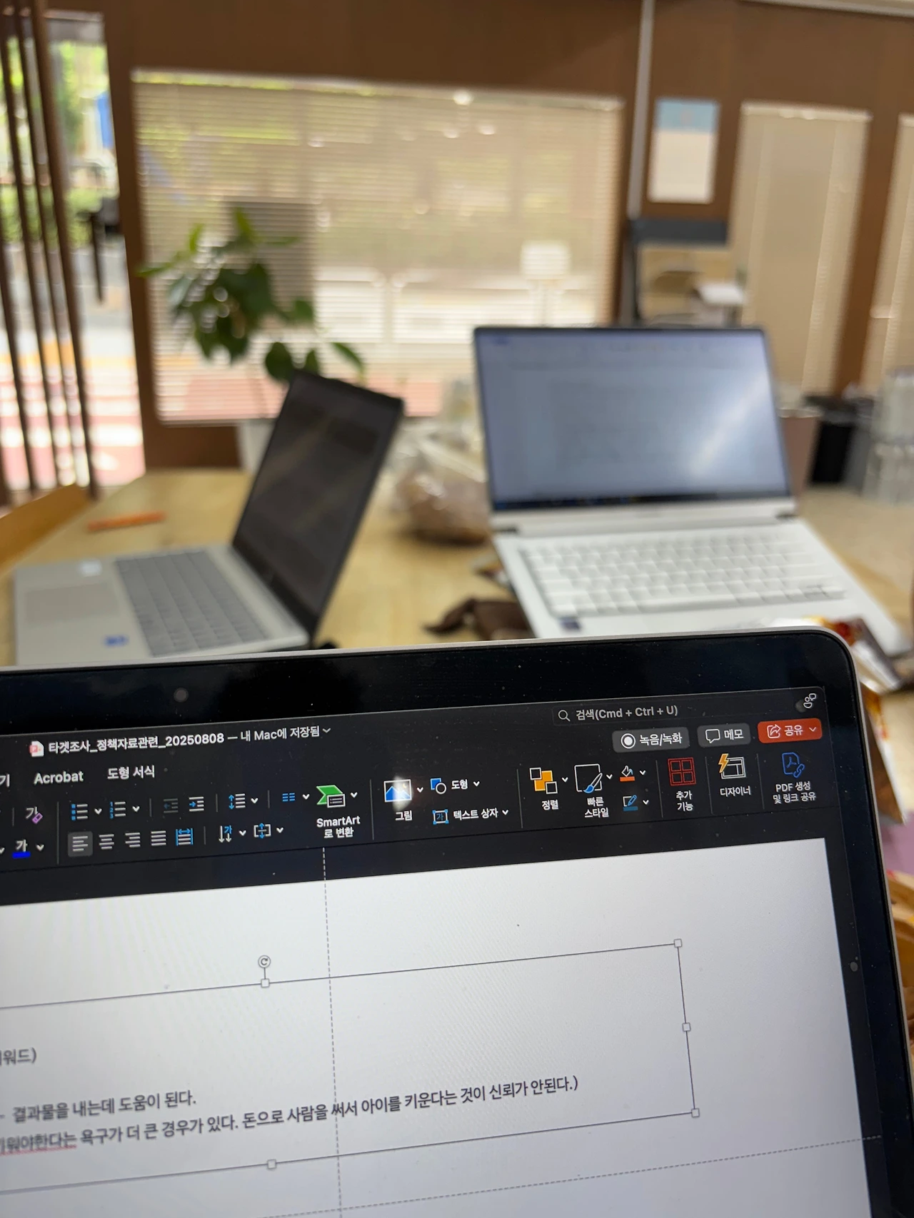 처음에는 조사 자료를 나열하듯 공유했지만, 어느 순간 대화는 자연스럽게 각자의 경험과 감정으로 번졌다. “이건 우리 얘기잖아.” 그 한마디 이후, 자료 속 엄마들은 통계가 아닌 얼굴 있는 존재가 되었고, 각자 마음속에 켜켜이 쌓아둔 생각들이 조금씩 풀렸다. 시작하며 회의 기록을 남기려고 핸드폰을 설치하는데, 지난주와 똑같은 옷을 입고 있던 김대표가 화면 속에 잡혔다. “이러다 우리가 거짓말쟁이로 오해받는 거 아냐?”라는 농담에 모두 폭소. “아직은 아무도 우리한테 관심 없을 확률이 더 크지”라는 현실적 한마디가 뒤따르며, 그 웃음 속에서 긴장감이 풀리고 회의는 한층 편안하고 깊어졌다.