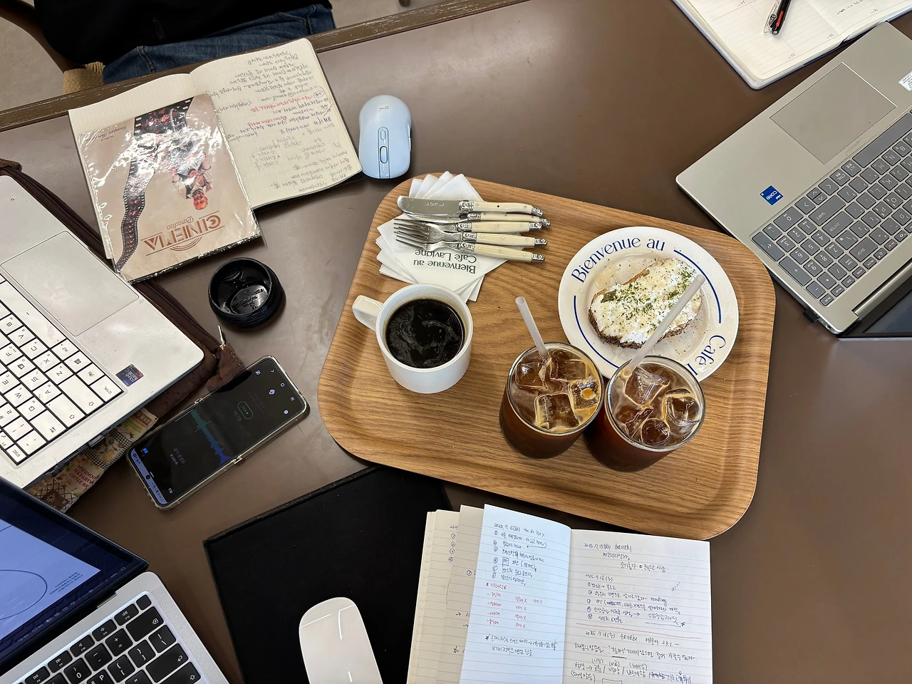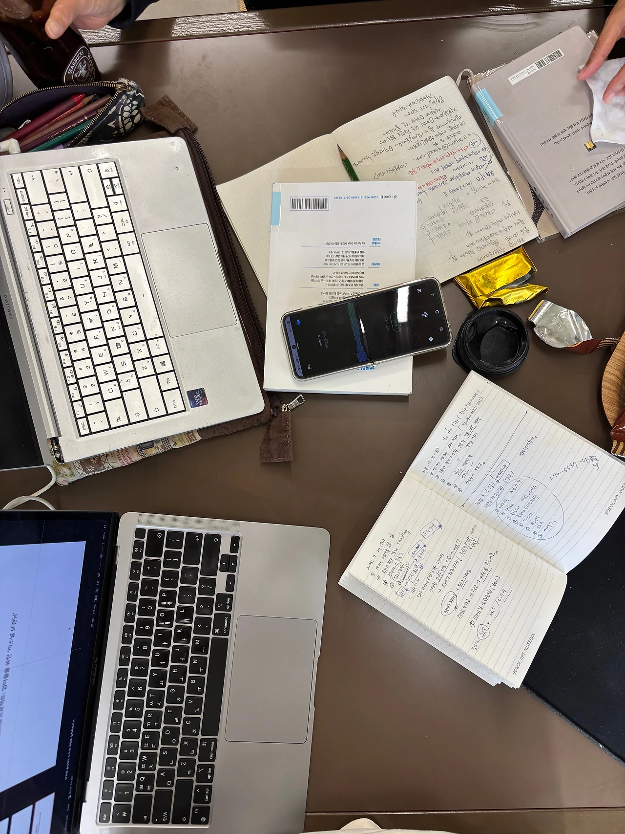 이번 회의는 다시 ‘악몽의 카페’에서 열렸다. 문대표가 과거 두 번이나 길을 잘못 들어 인천공항까지 갔던 기억 때문에 가기 싫어했지만, 오늘은 최대표의 운전 덕분에 무사히 골인. 원래는 15분 거리라는 사실이 문대표를 더욱 씁쓸하게 했다. 카페 오픈이 10시 반이라 우리는 먼저 옆집 원조국수집에서 국수를 먹었다. 원조국수와 비빔국수 두 그릇을 시켰는데, 세 명이 배를 부여잡고 나올 만큼 양이 어마어마했다. “이제는 회의보다 소화가 문제”라는 말이 터져 나올 판이었다. 카페로 올라가는 길에는 작은 해프닝도 있었다. 김대표가 와인 판매층에서 계산하지 않은 감자칩을 들고 올라왔는데, “계산은 밑에서”라는 말에 다시 내려가긴 귀찮고, 끝내 뜯지 못한 채 회의가 끝난 뒤 다시 제자리에 돌려놨다. 사소한 에피소드들이 오히려 회의 분위기를 한층 더 유쾌하게 만들었다.