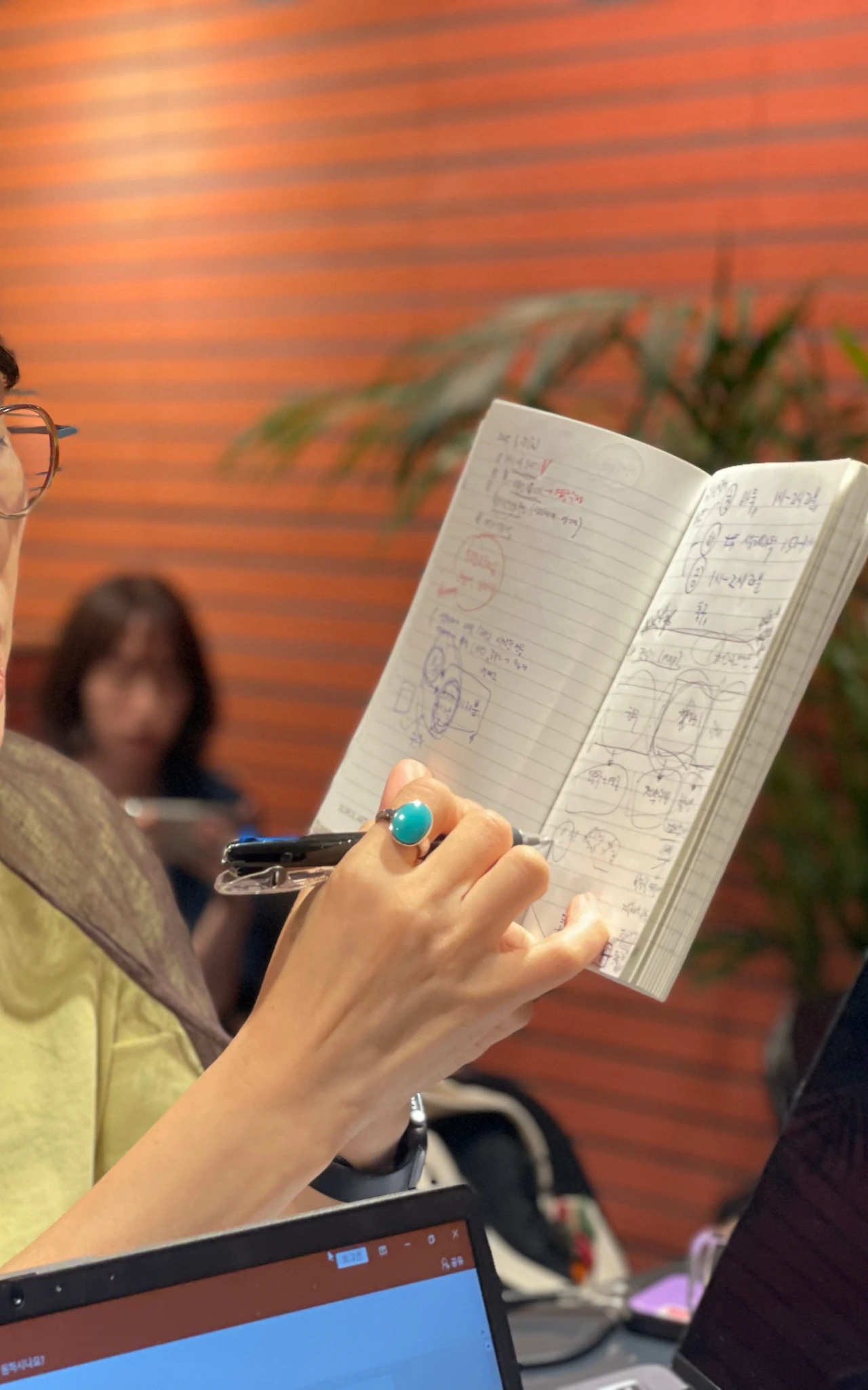 사실 이날 모임은 애초에 “매주 한 번”이 아니라 “더 자주 모여야 하는” 일정으로 바뀌어버렸다. 금요일 일산 그림책박물관 대표님과의 미팅이 확정되면서, 우린 월요일 밤에 또다시 모였다. 늦은 밤 카페, 빵빵한 에어컨 아래 최대표는 계속 “추워…”를 외쳤고, 김대표는 회의록을 맡았지만 핸드폰을 집에 두고 오는 바람에 부드럽지만 단호하게 “다녀오세요”라는 미션을 수행해야 했다. 결국 다시 집까지 갔다 오는 소동 끝에 본격 회의가 시작됐다.