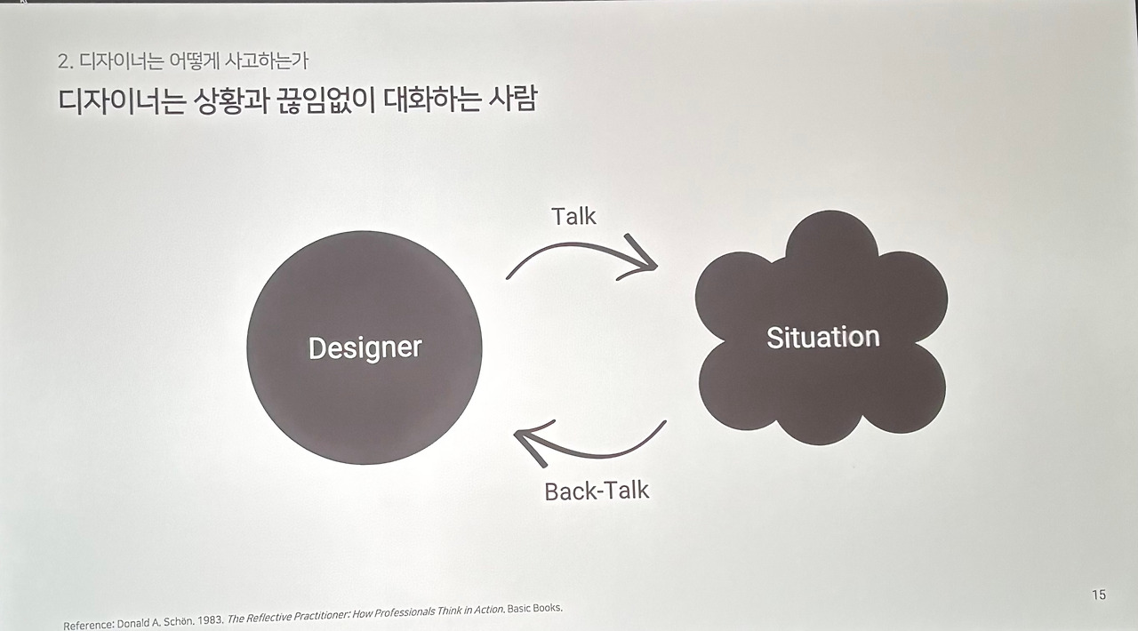 며칠 전, 한예종에서 열린 AI 디자인 연구 동향 세미나가 떠올랐다. 서울여대 교수님 발표 속 한 슬라이드가 인상 깊었다. AI의 등장으로 전문가들조차 흔들리고, 길을 찾지 못해 우왕좌왕하지만 결국 중요한 건 “디자이너가 무엇을 하는 사람인가”라는 물음이었다. 발제자 교수님은 도날드 쇤(Donald Schön)의 정의를 빌려 말했다. 디자이너란 상황과 끊임없이 대화하는 사람이다. 상황을 살피고, 피드백하고, 문제를 해결해 가는 조정자. 그 말이 마음에 깊이 남았다.