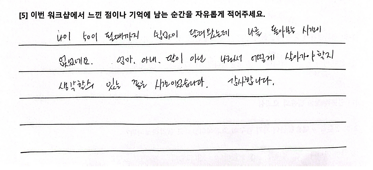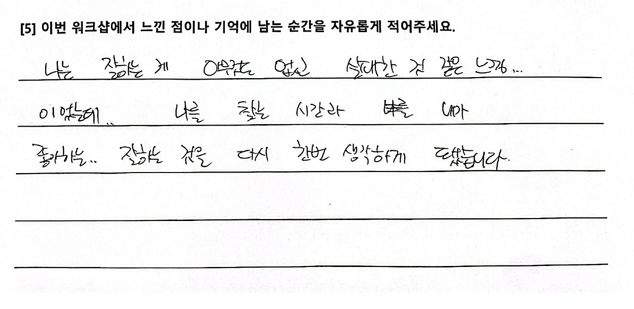 설문 응답에서 대부분의 엄마들이 ‘매우 만족’ 혹은 ‘만족’을 표시했다. 단순한 일회성 경험이 아니라, “이후에도 연결되고 싶다”는 의지가 강하게 드러났다. 이는 오늘의 워크샵이 단순한 체험이 아니라, 엄마들에게 필요한 일상 속 회복 프로그램으로 자리 잡을 수 있음을 보여주었다.