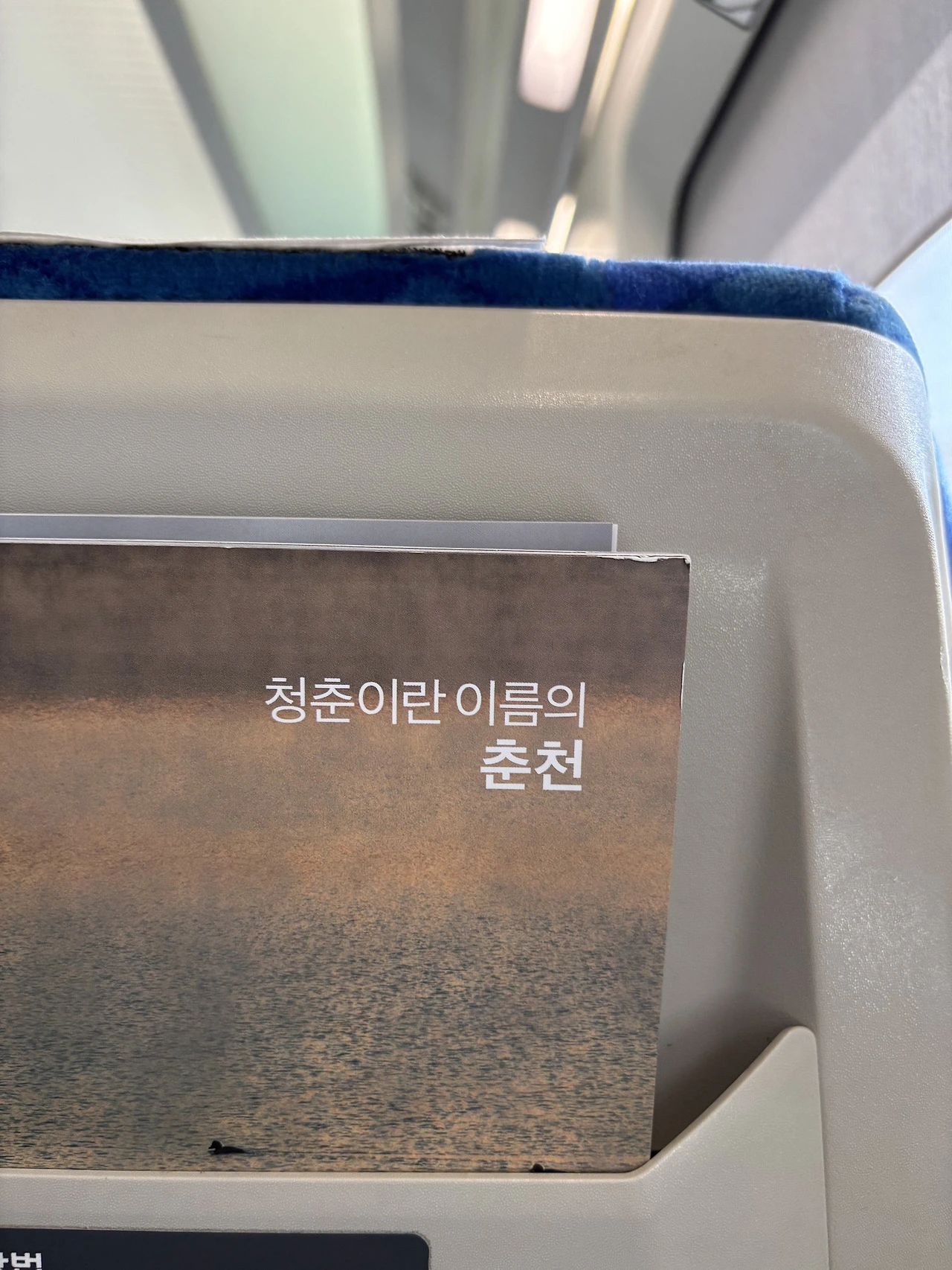 원래 나는 움직이는 차나 기차에서 글자를 보면 금세 멀미를 한다. 그래서 웬만하면 핸드폰조차 들여다보지 않는다. 그런데 오늘은 마음이 급해 노트북을 열었다. 켜자마자 느낌이 쎄했다. 결국 5분도 못 버티고 노트북을 닫았다. 그 순간, 내 눈에 들어온 건 의자에 꽂혀 있던 책 한 권. 《청춘이란 이름의 춘천》. 책 제목이 내게 질문을 던졌다. 나는 지금 어떤 이름을 가지고 살아가고 있을까?