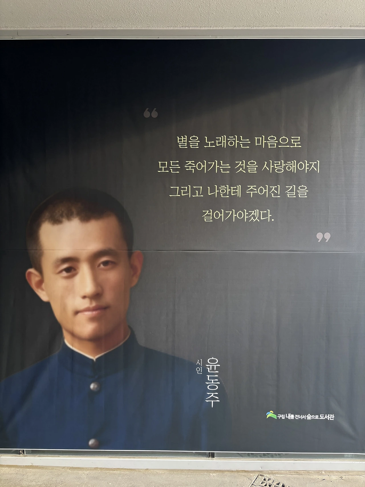 오늘은 둘째가 축구 방과후를 마치고 일찍 하교하는 날이었다. 학교 앞에는 차를 세워둘 공간이 없어, 내를 건너숲 근처에 있는 도서관 주차장에 잠시 차를 세우고 아이를 데리러 걸어갔다. 그 길에서 윤동주 시인의 모습과 함께 ‘서시’의 일부가 적힌 현수막이 보였다. 사람들은 대개 ‘모든 죽어가는 것을 사랑해야지’라는 구절에 멈춰 서는 것 같지만, 오늘 내 눈에 들어온 문장은 달랐다. ‘별을 노래하는 마음으로.’ 이 짧은 구절이 이상하게 마음에 남았다.
