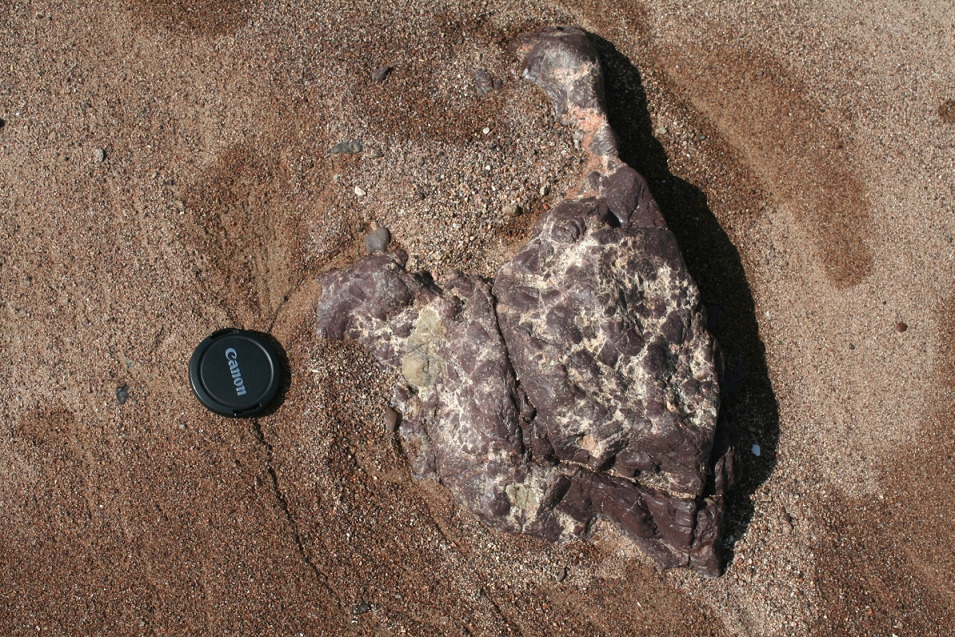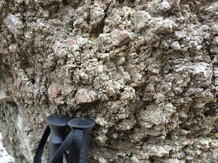 회색응회암과 붉은 셰일이 함께 엉켜있는 암석