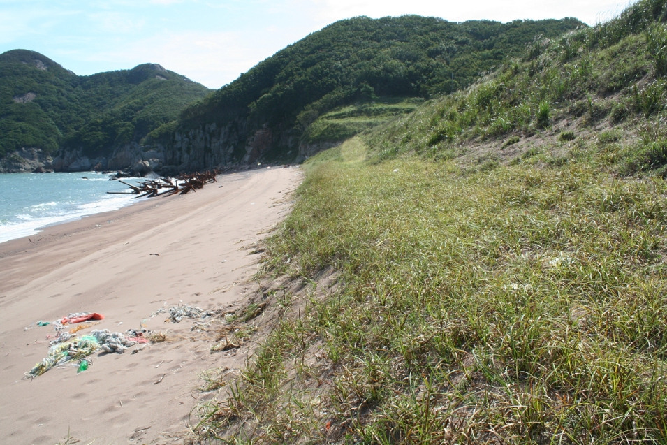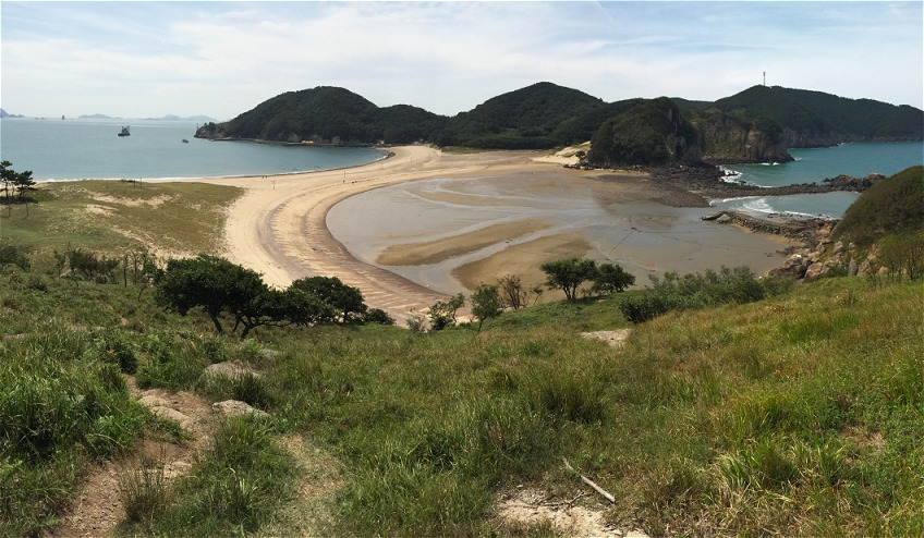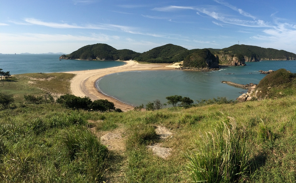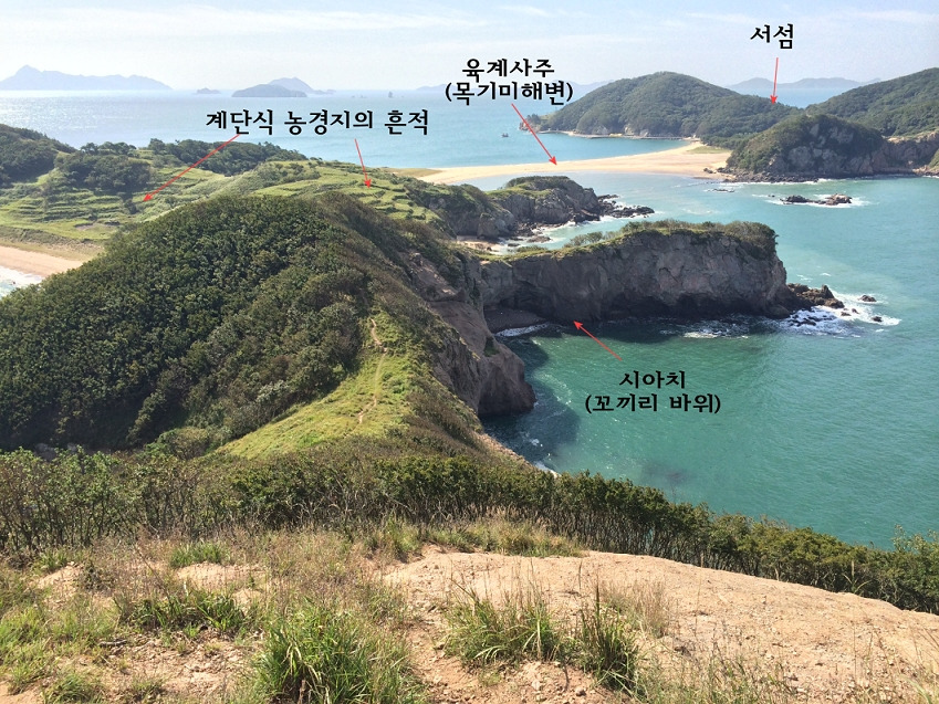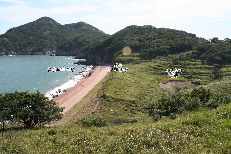 배를 타기 전까지 봐야 할 것들이 많다. 목기미 해변의 '사구'와 '육계사주', 코끼리 바위라 불리는 '시 아치' 그리고 붉은모래 해변의 사구와 그 뒤에 발달한 '사구습지'도 꼭 챙겨보고 싶었다. 먼저 해안에 나타나는 지형의 특징과 이름을 조금 알면 이 글을 읽기가 편하실 듯 하다. '사구'는 해변의 모래가 바람에 날려 쌓인 모래 언덕을 말하며, 사구 뒤쪽에는 '사구습지'가 발달하기도 한다. '사주'는 해변의 모래가 연안류를 따라 모래 기둥처럼 긴 형태로 쌓여 만들어진 지형인데, 육지와 섬(또는 섬과 섬)을 잇는 사주를 '육계사주'라고 부른다. 마지막으로 흔히 꼬끼리 바위로 불리는 '시 아치'는 파도에 의해 침식을 받아 형성된 아치 모양의 바위를 말한다.