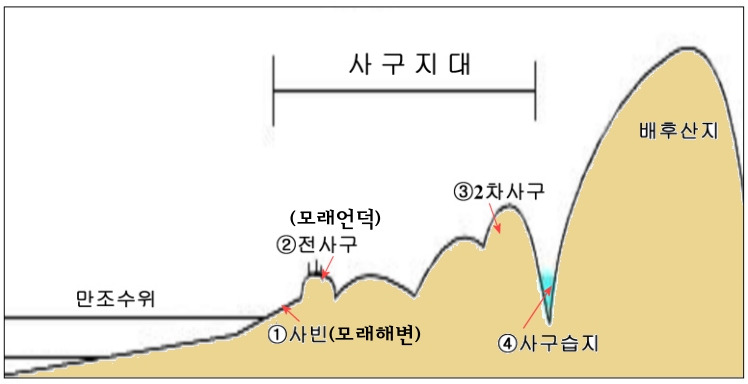 모래해변(사빈)의 모래가 날려 언덕처럼 쌓여 형성된 사구(모래언덕)과 그 배후의 습지 모식도 (환경부 자료)