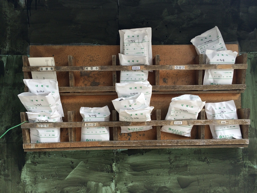 마을 입구 창고 벽면에 설치된 우편함. 10가구의 우편함에는 약봉투가 편지마냥 주인을 기다리고 있다.