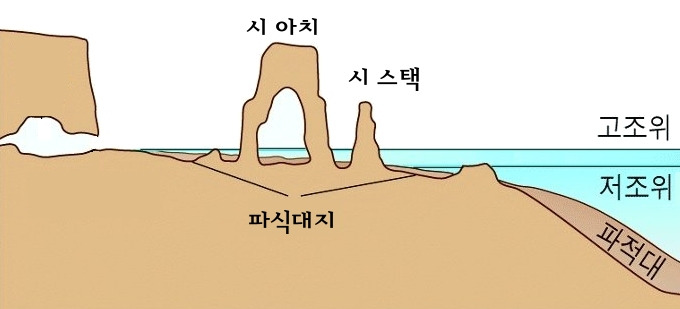 파도에 의해 침식되고 남은 암석이 꼬끼리 처럼 아치형태로 남아 있는 경우를 '시 아치'라고 부른다.