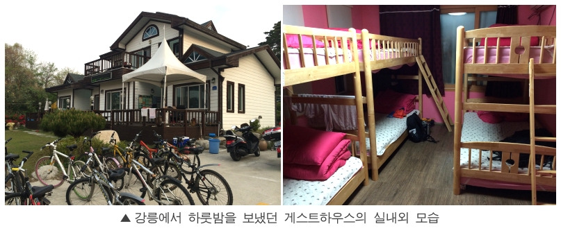 아침도 제대로 안 챙겨먹고 자전거를 달렸다. 목표하던 해안단구를 다 둘러보고 나니 더 허기가 몰려오는 듯 하다. 역무원 아저씨께 먹을 만한 식당을 추천받아 갔더니 예약손님이 많아, 그 옆에 있는 초당두부 식당에서 허겁지겁 점심을 먹었다. 점심을 먹고 나니 맥이 탁 풀렸다. 어깨에 짊어진 짐의 무게로 허리가 아파왔고, 왼쪽 다리 근육도 계속 당겨 빨리 숙소에 가 쉬고 싶어졌다. 아침에 입었던 두꺼운 겉옷을 가방에 쑤셔넣고 숙소가 있는 경포대 방향으로 무조건 달리기 시작했다. 오르막 구간에서 다리의 통증은 갈수록 심해지고 자전거의 속도는 점점 느려진다. 내 옆으로 다른 라이더들이 보란듯이 휙 지나쳐 간다. 옛날 같으면 오기로라도 따라잡으려 했겠건만 이젠 '내 체력이 이정도겠거니' 하고 쉽게 인정한다. 오죽헌, 경포호와 경포 해수욕장을 지나 오후 3시쯤 게스트 하우스에 도착했다. 방을 배정받고 간단히 샤워를 한 후 바로 곯아 떨어져 3시간 쯤 꿀잠을 잤다.