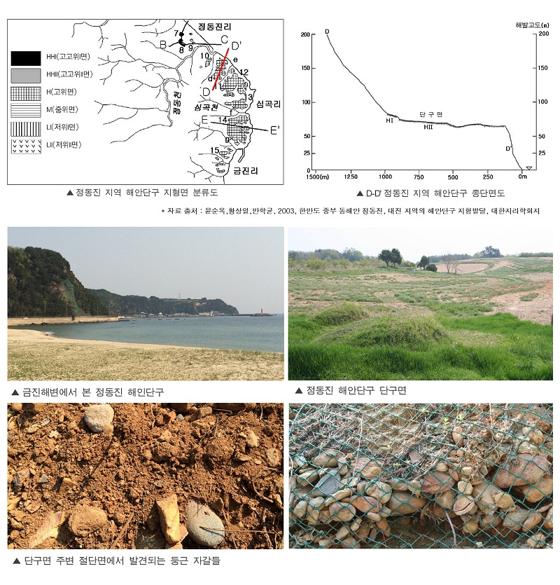 오늘 여행에서 가장 꼼꼼히 보고 싶었던 지형은 아름다운 정동진 해변이 아니다. 바로 정동진과 금진해변 사이에 있는 언덕이다. 이 언덕은 북쪽에 있는 정동진 해변에서도 잘 보이지만, 남쪽에 위치한 금진 해변에서 바라본 이 언덕이 더 전형적이다. '이깟 언덕이 뭐라고 그리 보고 싶으냐?'고 물으실지 모르겠다. 이 언덕이 바로 '해안단구(coastal terrace)'라고 불리는 지형이다. '해안단구'는 말 그대로 해안가에 나타나는 계단모양의 언덕을 말하는데, 과거에 파도에 의해 침식되어 평평해진 파식대지가 (육지가 상승하거나 바닷물이 하강해서, 또는 두가지가 결합되어) 계단처럼 드러나 보이는 해안 언덕을 말한다. 특히 동해는 황해보다 비교적 신생대 제3기말 이후 융기량이 더 많았기 때문에 해안단구를 전형적으로 관찰할 수 있는데, 정동진 해안단구가 바로 교과서같은 곳이다.