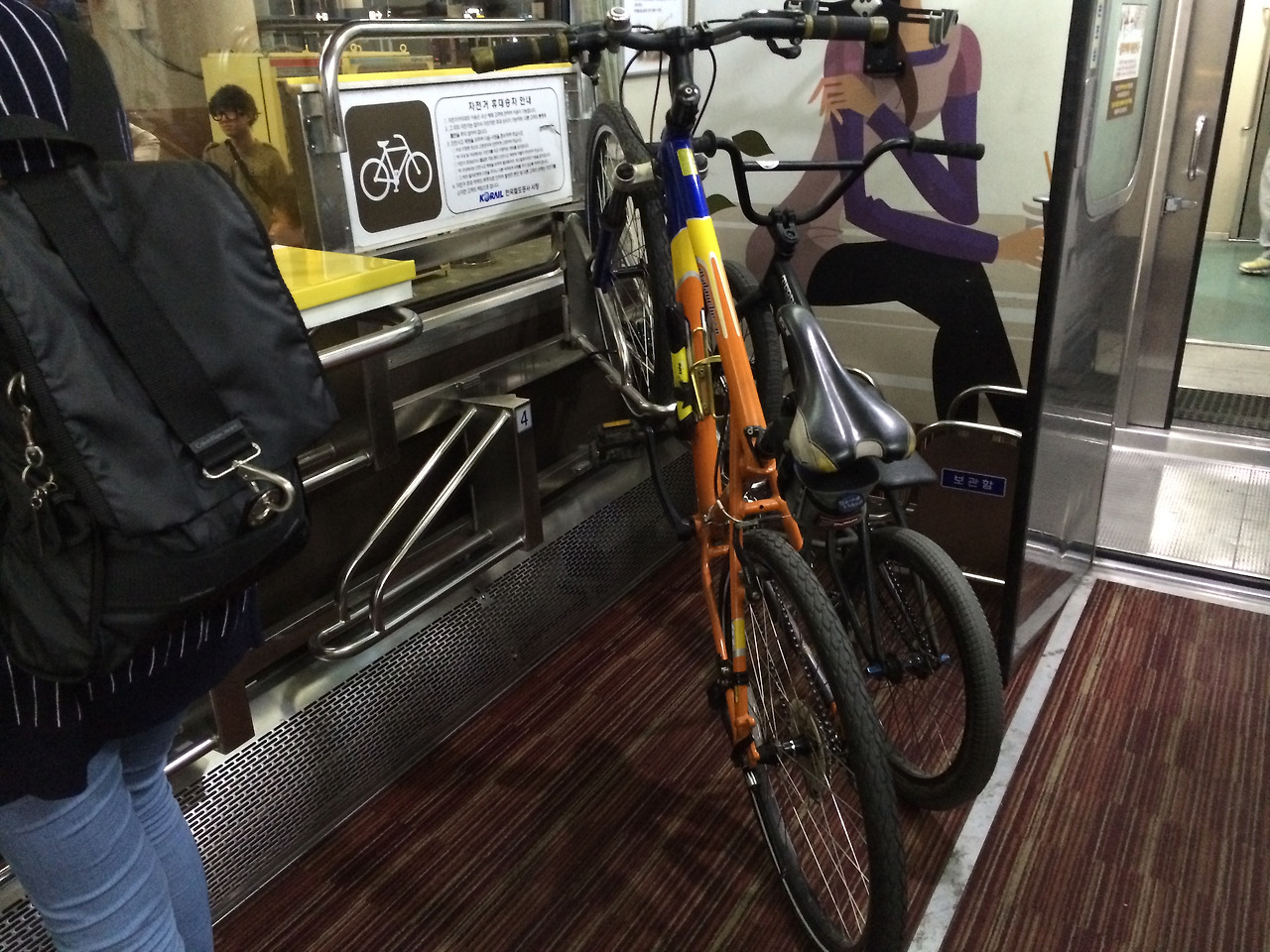 기차안에는 자전거를 거치할 수 있는 시설이 설치되어 있다