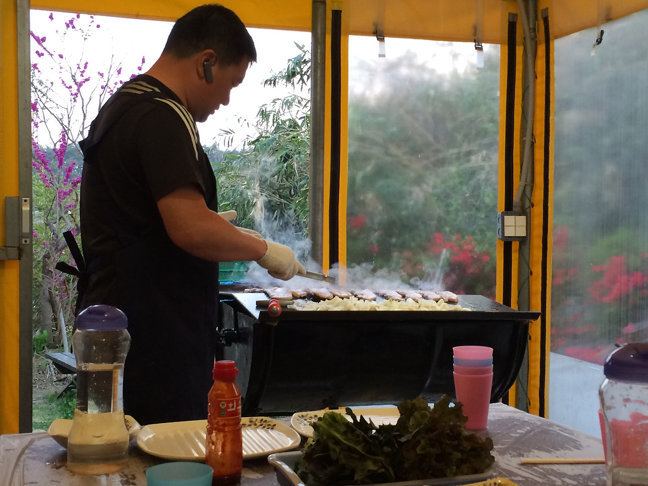서로 모르는 손님들이 함께 모여 즐거운 삼겹살 파티를 했다