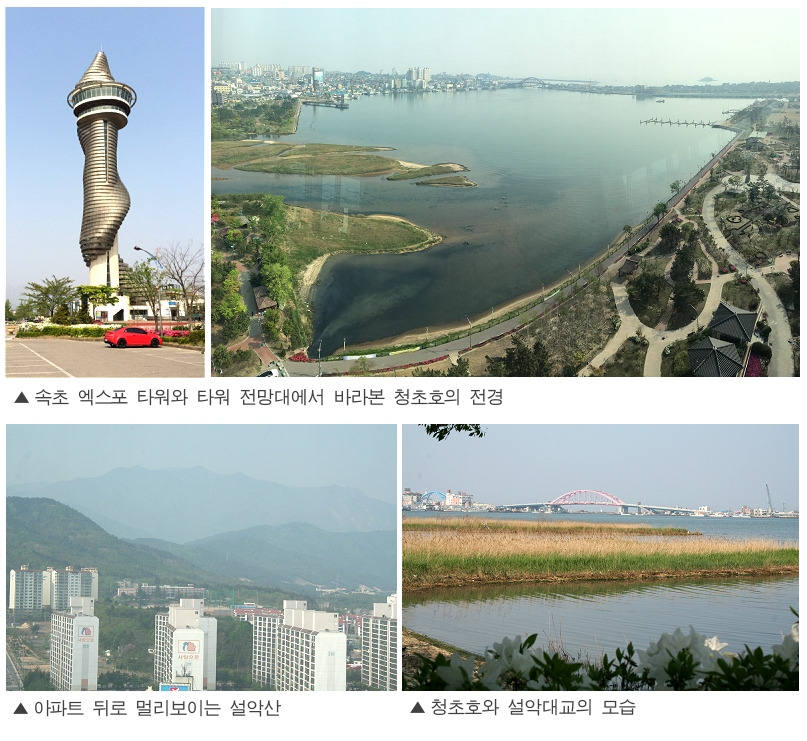 속초에는 청초호와 영랑호가 있다. 청초호를 가장 잘 조망하기 위해서는 엑스포공원에 위치해 있는 엑스포 타워에 올라가서 보면 좋다. 엑스포공원은 1999년 강원국제관광엑스포를 위해 조성된 공원이다. 아침 9시에 엑스포 타워에 도착하니 아무도 올라가는 사람이 없어 혼자 엘리베이터를 타고 전망대에 올랐다. 높은 곳에 오르니 속초 시내가 한눈에 시원하게 펼쳐진다. 속초 시내에 위치해서인지 청초호의 모습은 자연적인 석호의 모습을 찾기가 흠들고, 주민들과 관광객들을 위한 인공적인 유원지와 항구의 역할을 하고 있었다. 만의 입구를 막은 긴 모래톱(사주) 위에는 도로와 다리가 연결되어 있었고, 다리 아래로 배들이 지나 다니는 모습을 볼 수 있었다. 전망대에서는 설악산의 모습을 볼 수 있었는데, 맑은 날씨지만 연무때문인지 시계가 좋지 않아 울산바위의 모습을 제대로 볼 수 없어 아쉬웠다. 전망대에서 내려와 자전거를 타고 청초호를 한번 돌아본 후 영랑호로 향했다.