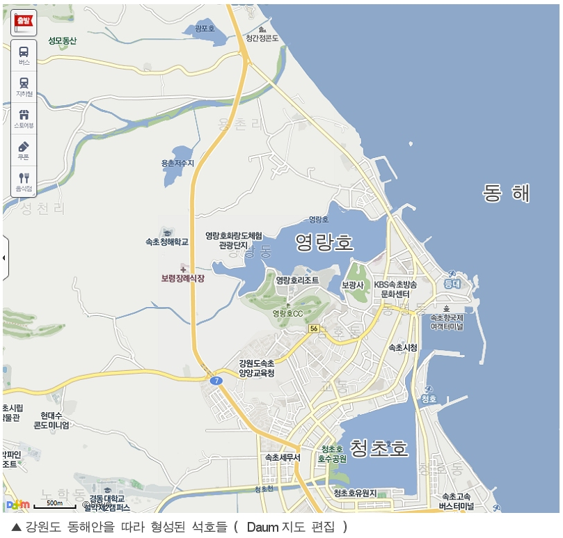 여름철에 강원도 해수욕장으로 여행을 가기 위해 지도를 펼쳐보자. 눈치가 빠른 사람이라면 해안을 따라 호수가 줄지어 있는 걸 알게 될 것이다. 강릉 경포해수욕장 뒤에 위치한 경포호가 있고 그 밖에도 양양의 포매호, 속초의 청초호, 영랑호, 그리고 고성의 송지호, 화진포 등의 호수가 해안을 따라 줄을 서고 있다.