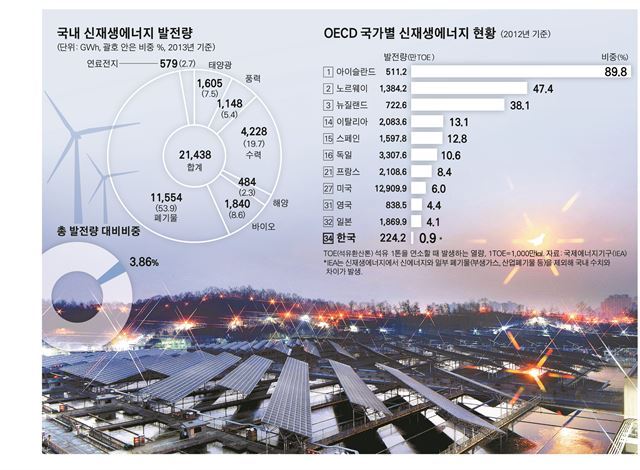2015년 통계에 의하면 우리나라는 OECD국가중 신재생 에너지 비율이 단연 꼴찌다. 그나마도 신재생에너지 생산량의 대부분을 차지하는 폐기물 소각과 수력을 제외하면 태양광과 풍력의 에너지 생산은 미미하다. 미래세대를 위한 다른 나라의 움직임에 비해 부끄러운 수준이다.