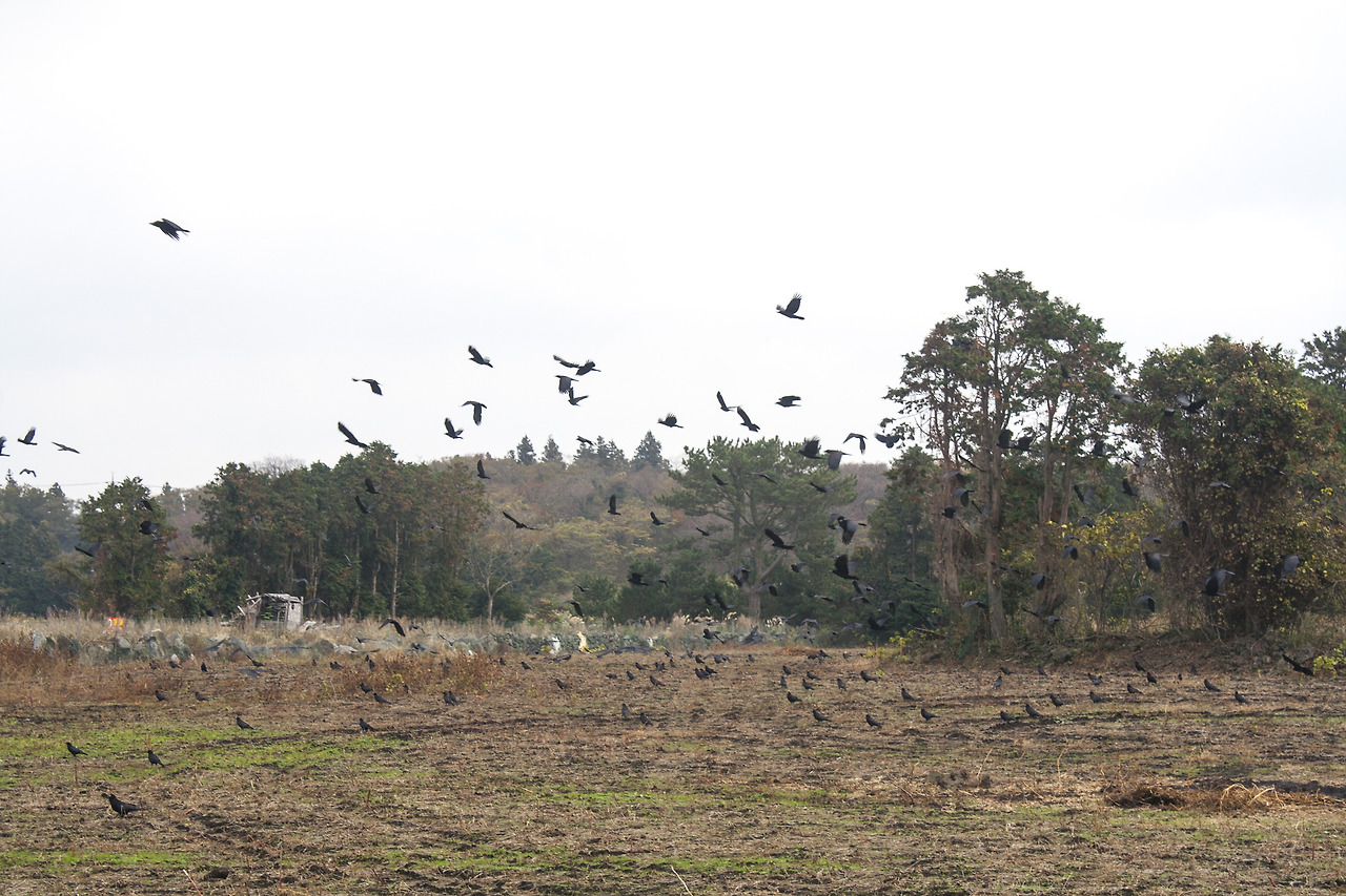 이 녀석들은 떼지어 하늘을 빙글빙글 돌다가 전깃줄에 줄지어 내려 앉거나, 농경지에 내려 앉아 먹이를 먹는다. 가을 걷이를 끝낸 우리집 앞 콩밭에는 매일 수 백 마리 까맣게 내려 앉아 식사를 하는 모습을 볼 수 있다. 사진을 찍기 위해 카메라를 들고 살금살금 다가갔더니 전봇대에서 망을 보던 한 녀석이 깍깍 소리를 냈다. 그러자 식사를 하던 까마귀들이 일제히 날아올라 전깃줄에 올라 앉는다.
