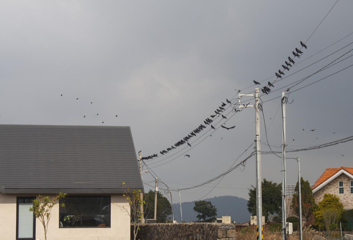 제비가 떠나고 10월 들어 전깃줄을 차지한 녀석들은 까마귀떼이다. 여름에도 까마귀가 몇 마리가 있었지만 최근에 수 백 마리가 떼를 지어 몰려와 조금 놀랐다. 검색해 보니 이 친구들은 겨울에 시베리아나 몽골에서 추위를 피해 우리 나라에 찾아오는 겨울 철새인 떼까마귀란다.