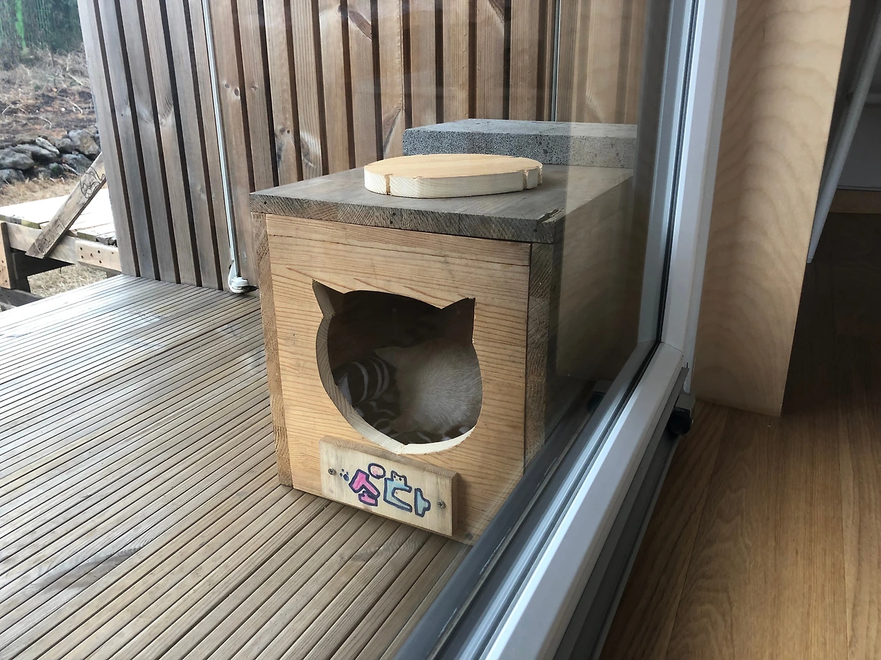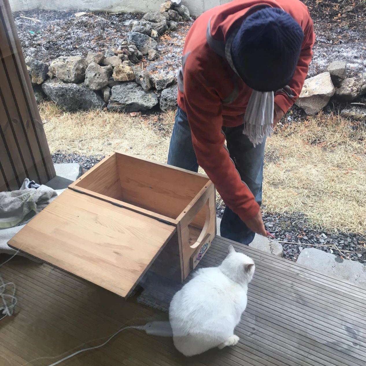 대충 챙겨 입고 밖으로 나가 소다 집을 만들었다. 공구함으로 만들어 사용하던 나무 상자를 소다집으로 리모델링 할 작정이다. 안에 들어있던 공구들은 창고에 대충 구겨 넣었다. 먼저 직소를 이용해 소다가 들락날락할 구멍을 동그랗게 뚫었다. 배가 뚱뚱하니 조금 크게 입구를 만들었다. 인터넷에서 본 것처럼 동그란 출입구를 고양이 귀 모양으로 자르니 그럴듯해 보인다. 지난여름 버리지 않고 모아두었던 은박 보냉팩을 바닥에 깔고, 그 위에 담요를 접어 다시 깔았다. 마지막으로 딸 채희가 직접 이름을 새긴 명패를 집 앞에 달았다.
