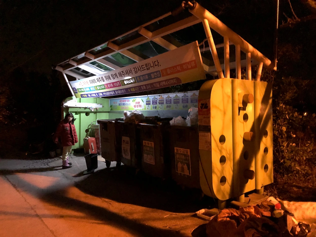 제주도에는 곳곳마다 ‘클린하우스'라는 시설이 있다. 마을 곳곳에 만들어 둔 쓰레기 분리수거장이라고 생각하면 쉬운데, 요일별로 해당되는 재활용품이나 일반 쓰레기를 배출하는 곳이다. 배출해야 하는 시간이 늦다 보니 주로 밤에 이곳을 찾게 되는데, 가로등이 드문드문 서 있는 길을 200미터 정도 걸어가야 해 살짝 무섭다.