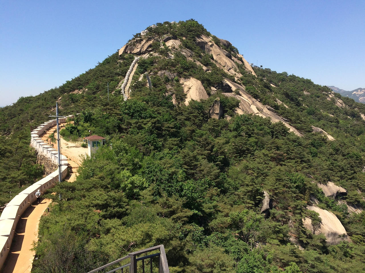 정상에서 창의문쪽으로 내려오는 길도 경사가 만만치 않으나 다행히 계단이 잘 되어 있어 무리없이 내려 올 수 있었다. 도중에 청와대가 보이는 쉼터에서 준비해온 점심과 물로 간단하게 허기를 달랜다. 박근혜씨가 탄핵되고 새롭게 당선이 된 문재인 대통령에 대한 국민들의 기대와 지지가 높다. 2014년 박근혜씨가 대통령일때 북악산에서 청와대를 보고는 화를 냈었는데, 오늘은 왠지 친근한 느낌이 든다. 청와대가 보이는 벤치에 길게 누워 시원한 바람과 하늘을 보며 책을 읽는 기분이 새롭다.