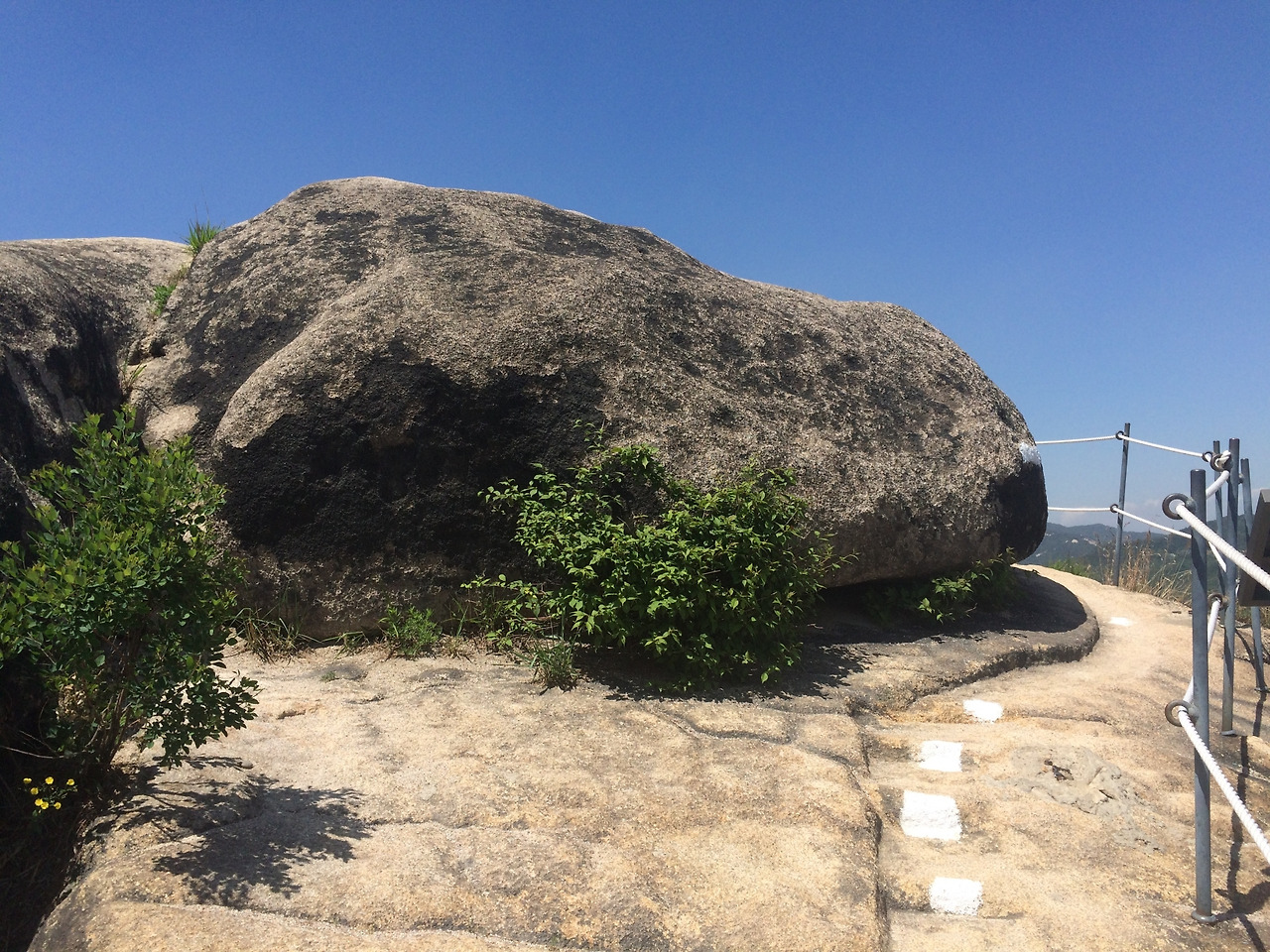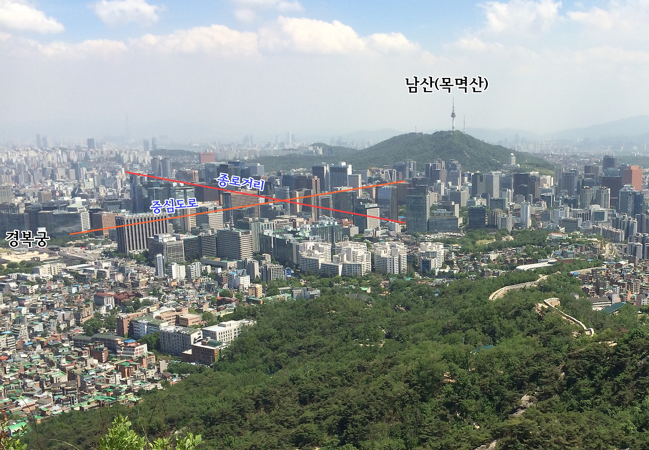 인왕산 정상을 올라가는 군데군데 등산복을 입고 선글라스를 낀 무표정한 군인들이 지키고 있다. 시작하는 지점에서는 경사가 급하지 않더니 범바위를 지나고 인왕산에 가까워지면서 경사가 가파르다. 해발고도는 겨우 340미터이지만 나에게는 에베레스트로 보였다면 과장일까? 인왕산 정상부는 급경사의 큰 화강암 암반으로 되어 있고, 바위를 깨어 내 좁은 계단을 만들어 놓았다. 후달거리는 다리를 위로하며 로프를 잡고 겨우 정상에 오를 수 있었다. 정상에 올라 널뛰는 심장을 겨우 진정시키고 나서야 한양 도성과 서울의 모습이 한눈에 들어온다. 경복궁을 기준으로 숭례문(남대문)까지 남북방향으로 이어지는 서울의 중심도로망이 보이고, 멀리 목멱산이라 불리던 남산과 남산타워도 보인다.