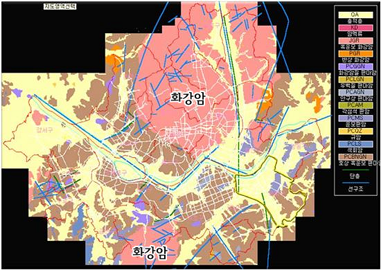 <서울의 지질도 > 분홍색으로 표시된 서울도심, 북한산 주변, 관악산 주변이 화강암 분포지역이다. 참고로 갈색은 편마암 분포지역이다.