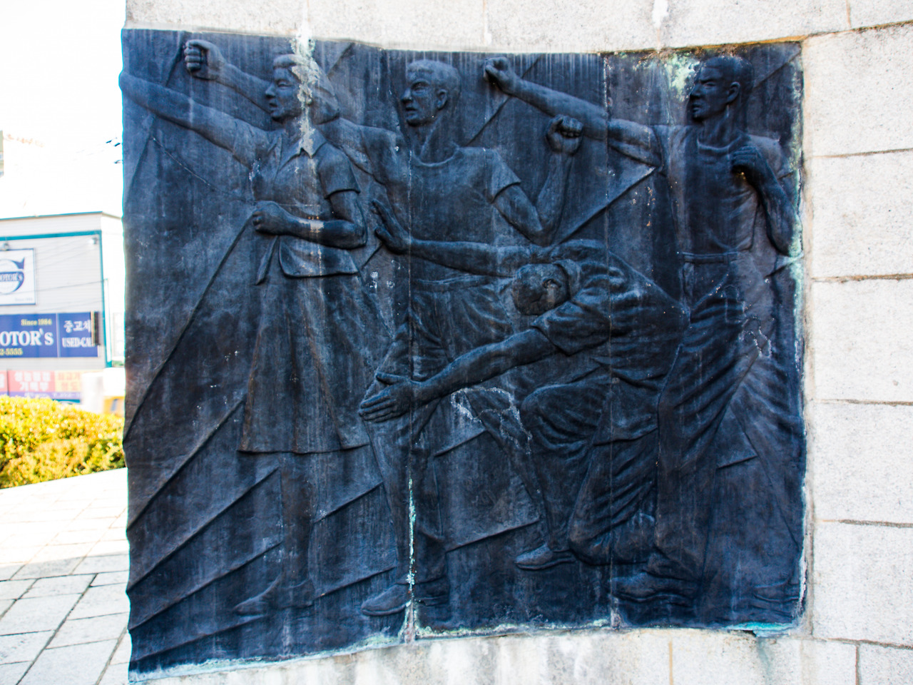 탑신 아래에 끼워진 청동 부조는 그때 상황을 웅변한다. 절규하고 저항한다.