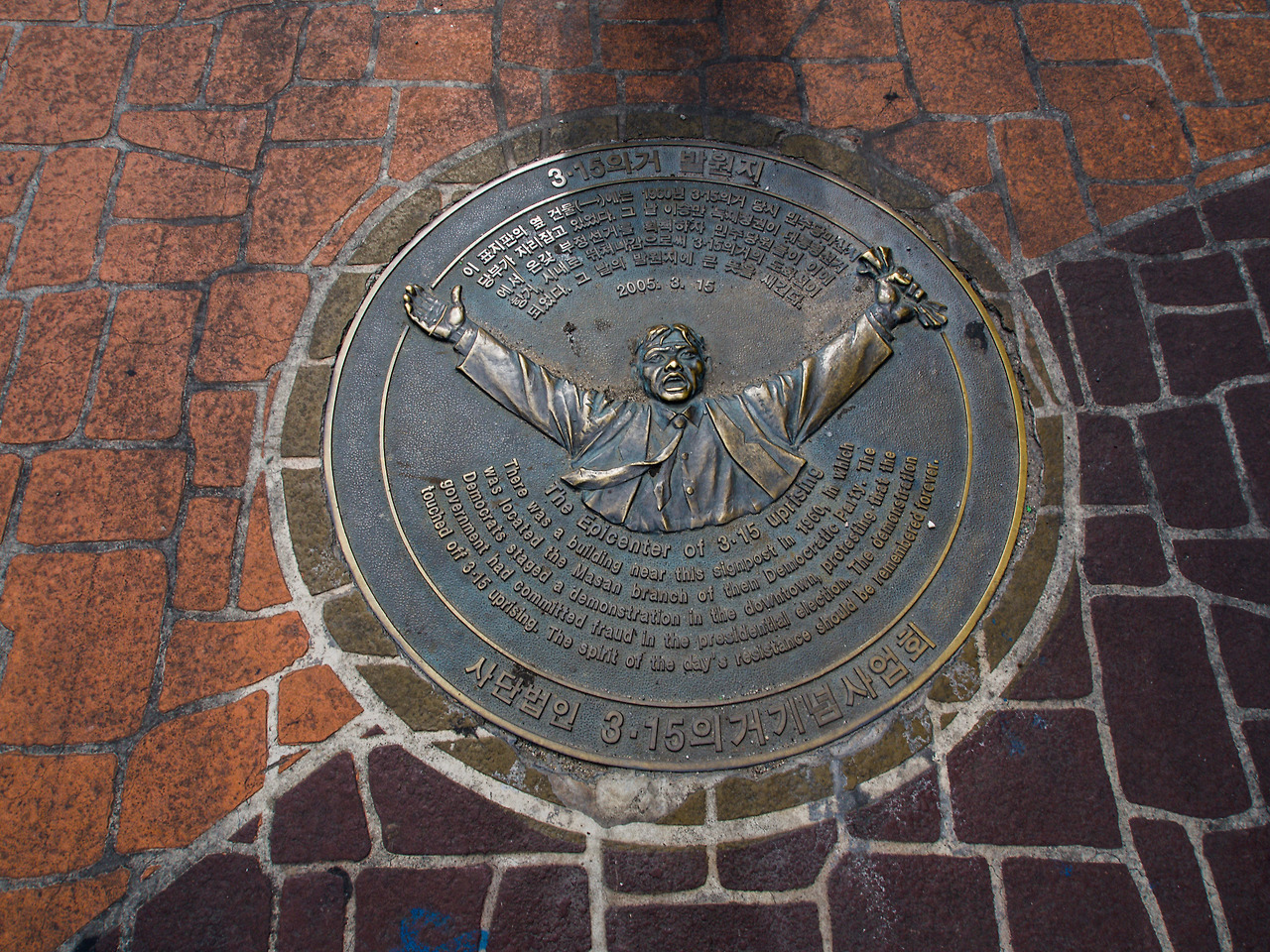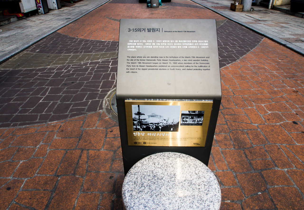 의거 발원지인 옛 민주당 마산시 당부가 있던 건물 앞 인도 한가운데 바닥에 표지 동판과 안내물이 있다. 부정선거를 소리치는 함성이 들리는 듯하다.