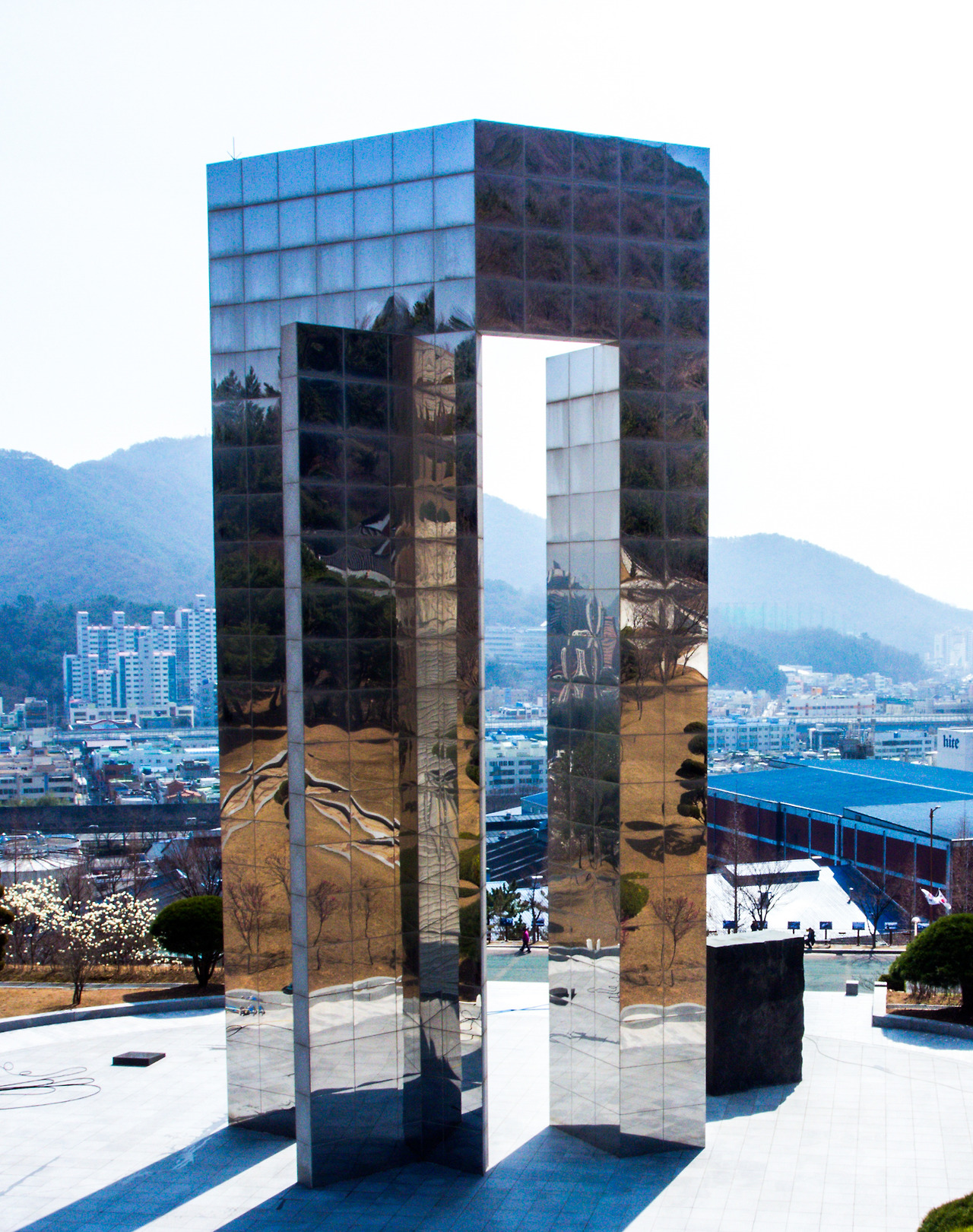 이 문의 큰 묘미는 양면성이다. 참배단을 향하는 전면에서 보면 화강석의 문이지만, 통과한 뒤 남측 시가지를 향해서 보면 반사되는 금속판의 문이다. 저세상과 현실 경계이다. 그런데 현실을 쳐다봐도 저세상이 되비친다. 함께 있다는 것인지. 저쪽에서는 문은 장애는커녕 경계도 못 되는 듯하다.