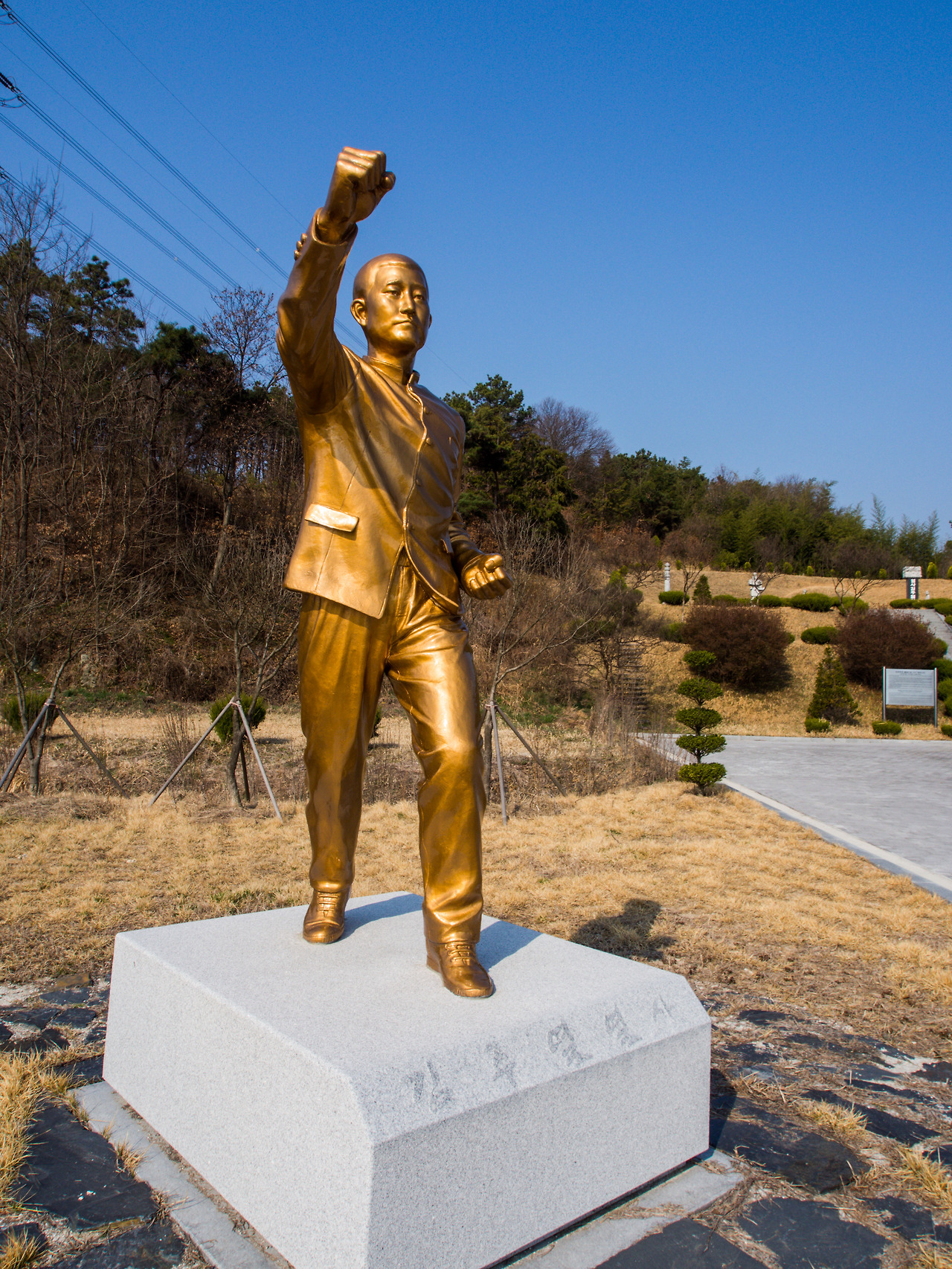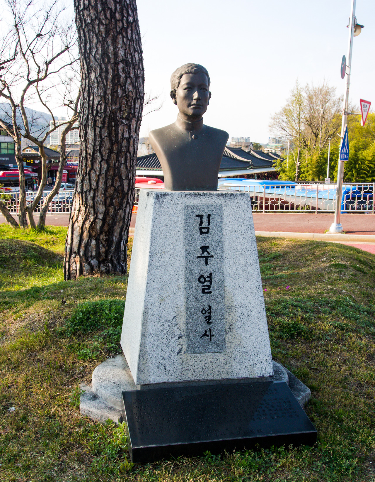 열사의 묘지 앞, 텅 빈 광장은 스산하다. 그 가운데 열사 상이 호젓하다. 황동 빛이 어색할 정도이다. 그런데 의외로 표정은 담담하다. 광한루 주차장 입구의 녹지 속 흉상도 마찬가지다. 참혹한 사진에 물든 탓인가. 이렇게 곱고 차분한 모습인데. 바른 눈빛이 더 가슴을 저미게 만든다. 여기에서 조형성 운운하는 것은 부질없는 짓이다.